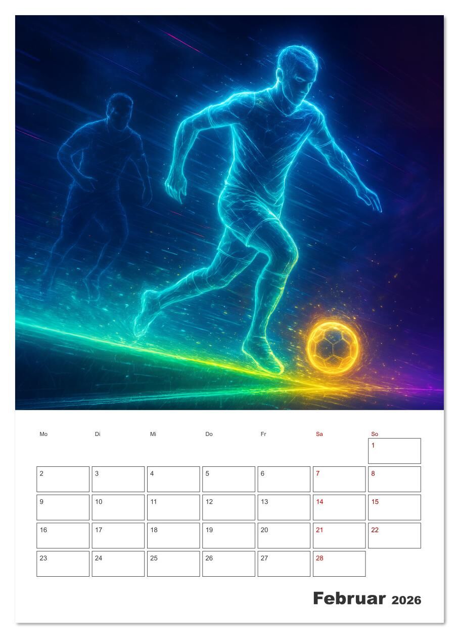 2026 Vision Fußball zeigt das Spiel, wie du es noch nie gesehen hast: voller Dynamik, Licht und Emotion. In leuchtenden Neonfarben erwachen mit KI generierte Fallrückzieher, Zweikämpfe und Teamgeist-Momente zu futuristischem Leben. Dieser Kalender fängt nicht ...