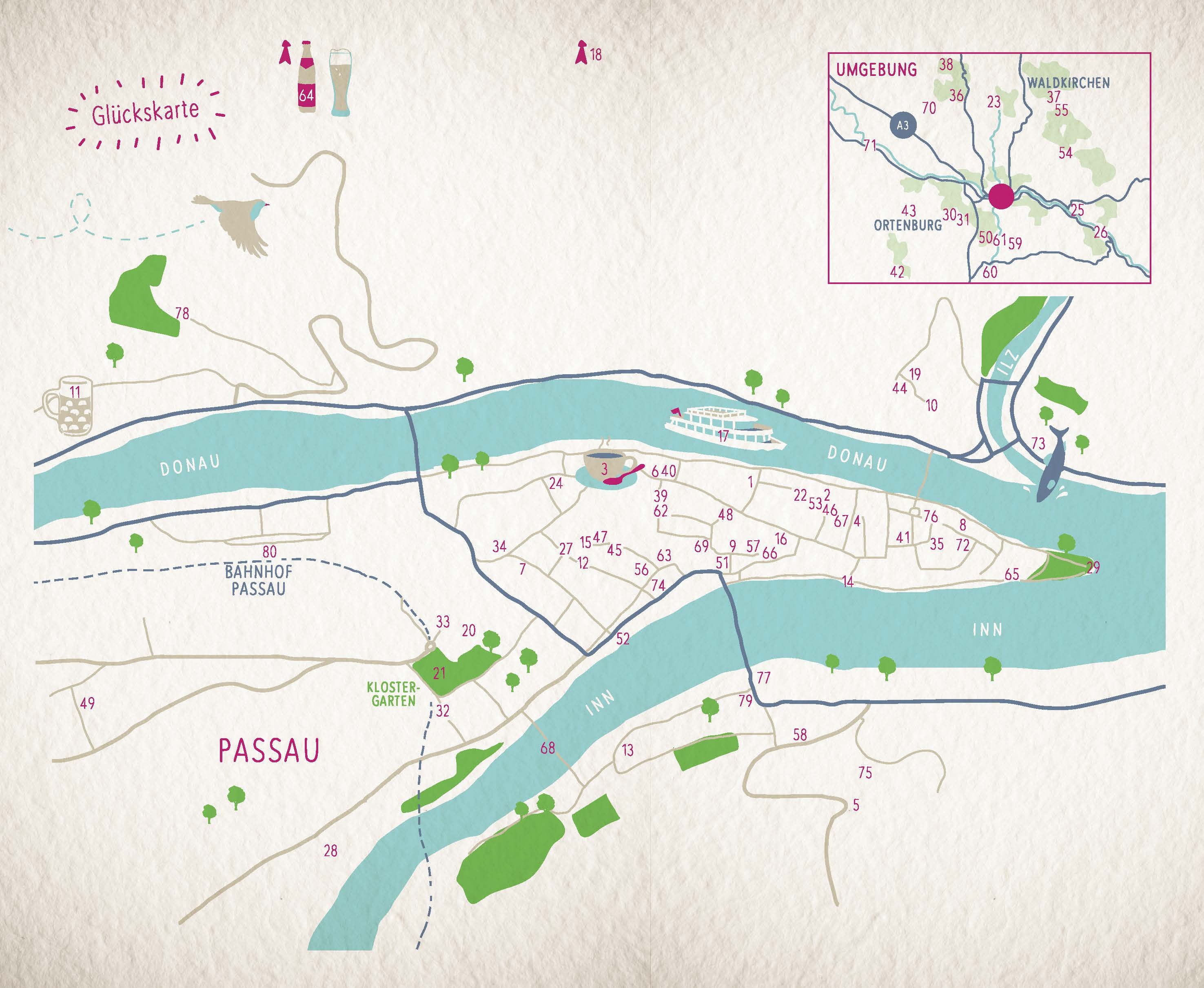 Eine Stadt, drei Flüsse, 80 Glücksorte das ist die Glücksgleichung für Passau. Den Bayerischen Wald direkt vor der Tür und die Alpen im Rücken zieht die ehemalige Residenzstadt Glückssuchende geradezu magisch an. Ob bei Jazz im Rathaushof, beim Entspannen am s...