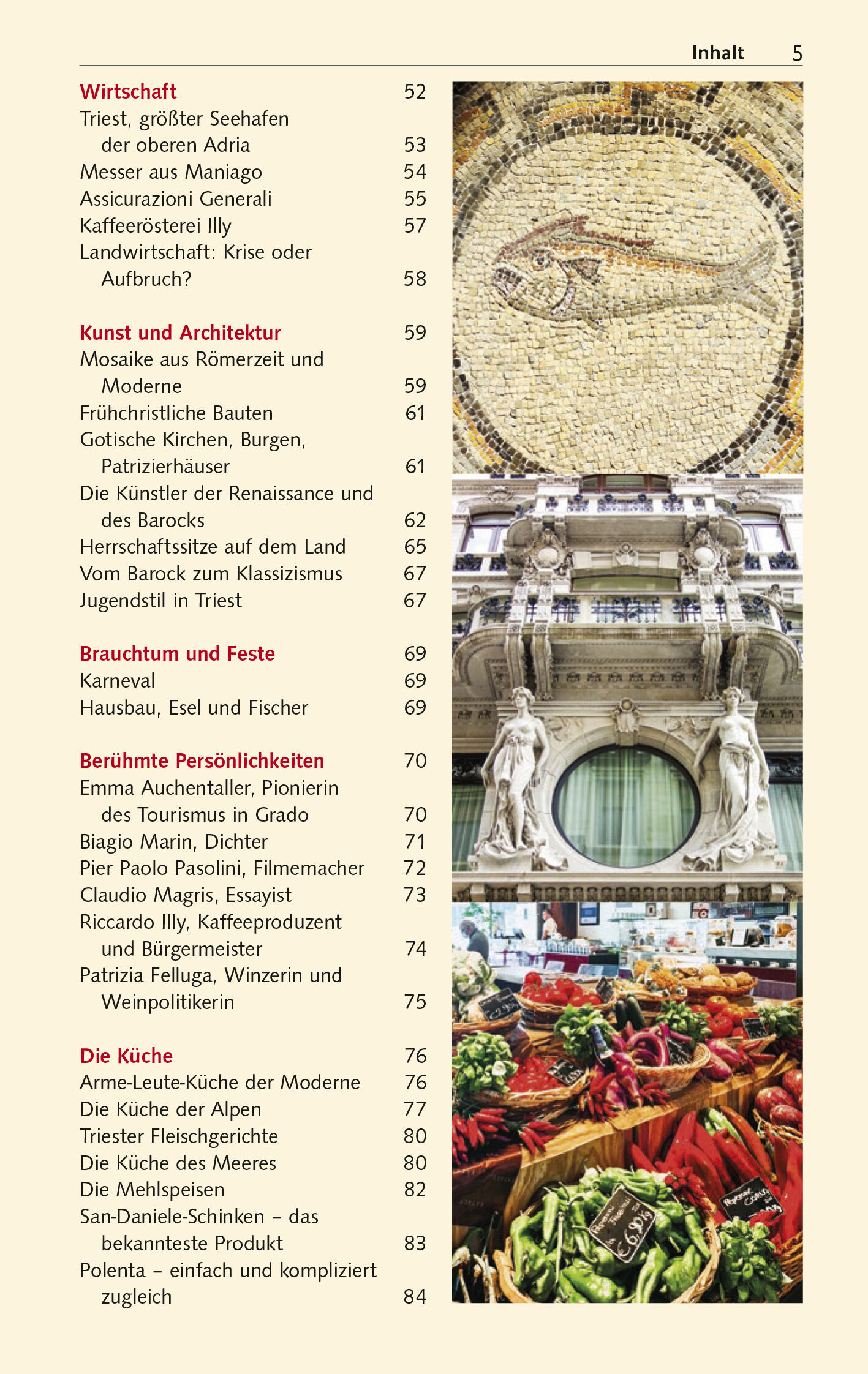 Vorwort 13 Die schönsten Reiseziele 14 Das Wichtigste in Kürze 16 Unterwegs mit Kindern 18 Entfernungstabelle 19 LAND UND LEUTE 21 Friaul-Julisch Venetien im Überblick 22 Geologie und Geografie 23 Afrikanische gegen Eurasische Erdplatte 23 Karnische und Julische Alpen 23 Die Ebene zwischen Alpen und Adria 27 Die Adriaküste und ihre Lagunen 29 Der Golf von Triest 31 Der wichtigste Fluss: Tagliamento 33 Der umkämpfte Fluss: Isonzo 35 Ökologische Probleme 36 Geschichte 38 Wer waren die Karner? 38 Wie Cäsar Friaul-Julisch Venetien den Namen gab 38 Streit um das Wesen Gottes 39 Wechselnde Herrscher im Frühmittelalter 39 Wie die Langobarden Italien veränderten 40 Die Patriarchen von Aquileia 42 Unter der Herrschaft des Markuslöwen 43 Das Ende Venedigs und der italienische Freiheitskampf 44 Die Schlachten am Isonzo 45 Italianisierung unter Mussolini 46 Der Zweite Weltkrieg und die Folgen 47 Die Autonome Region entsteht 49 Die Erdbeben von 1976 50 Wirtschaft 52 Triest, größter Seehafen der oberen Adria 53 Messer aus Maniago 54 Assicurazioni Generali 55 Kaffeerösterei Illy 57 Landwirtschaft: Krise oder Aufbruch? 58 Kunst und Architektur 59 Mosaike aus Römerzeit und Moderne 59 Frühchristliche Bauten 61 Gotische Kirchen, Burgen, Patrizierhäuser 61 Die Künstler der Renaissance und des Barocks 62 Herrschaftssitze auf dem Land 65 Vom Barock zum Klassizismus 67 Jugendstil in Triest 67 Brauchtum und Feste 69 Karneval 69 Hausbau, Esel und Fischer 69 Berühmte Persönlichkeiten 70 Emma Auchentaller, Pionierin des Tourismus in Grado 70 Biagio Marin, Dichter 71 Pier Paolo Pasolini, Filmemacher 72 Claudio Magris, Essayist 73 Riccardo Illy, Kaffeeproduzent und Bürgermeister 74 Patrizia Felluga, Winzerin und Weinpolitikerin 75 Die Küche 76 Arme-Leute-Küche der Moderne 76 Die Küche der Alpen 77 Triester Fleischgerichte 80 Die Küche des Meeres 80 Die Mehlspeisen 82 San-Daniele-Schinken das bekannteste Produkt 83 Polenta einfach und kompliziert zugleich 84 Montasio der wichtigste Käse 85 Veganes und Vegetarisches 86 Besondere Restaurants 87 Die Weine des Friaul 89 Die Weißweinrevolution 89 Weinbaugebiete und Rebsorten 91 Autochthone Sorten 93 DIE WICHTIGSTEN STÄDTE UND IHRE UMGEBUNG 97 Triest 99 Geschichte 100 Orientierung 105 Piazza Unità d'Italia 105 Teatro Verdi 110 Piazza della Borsa 113 Auf den Colle di San Giusto 113 Altstadt 118 Borgo Giuseppino 118 An den Kais entlang 118 Borgo Teresiano 123 Vom Golf von Triest hinauf auf den Karst 132 Castello di Miramare 133 Castello di Duino 134 Prosecco 136 Opicina 136 Grotta Gigante 137 Gedenkstätte Foiba von Basovizza 138 Koper 138 Muggia 141 Vernichtungslager San Sabba 141 Udine 142 Geschichte 142 Rundgang 145 Castello 145 Piazza della Libertà 149 Kathedrale 151 Durch die Altstadt 153 Patriarchenpalast 156 Villen südlich von Udine 160 Pordenone 164 Geschichte 164 Entlang des Corso Vittorio Emanuele II 165 Rathaus 168 Dom San Marco 168 Grünanlagen 169 Villa Correr Dolfin 170 San Vito al Tagliamento 173 Abtei Sesto al Reghena 174 Abteikirche Santa Maria in Sylvis 174 Gorizia und Nova Gorica 176 Geschichte 176 Orientierung 179 Rund um die Piazza della Vittoria 179 Die südliche Unterstadt 183 Auf die Burg 184 Nova Gorica 185 DER NORDEN: DURCH KARNISCHE UND JULISCHE ALPEN 189 Tarvisio 191 Geschichte 192 Tarvisio heute 193 Monte Lussari 193 Laghi di Fusine 194 Abstecher nach Slowenien: Am Oberlauf des Isonzo 196 Cave del Predil 196 Lago und Passo del Predil 197 Bovec 197 Jóf di Montasio 198 Val Canale 200 Tolmezzo 201 Geschichte 201 Altstadt Borgàt 202 Burgruine und Torre Picotta 203 Abstecher nach Zuglio 203 Durch die Karnischen Alpen 205 Socchieve 205 Sauris 206 Forni di Sotto und Forni di Sopra 210 Val Pesarina 212 Monte Zoncolan 217 Durchs Val Degano nach Sappada 217 In den Dolomiten durch das Valcellina 219 Die Staumauer des Vajont 219 Cimolais 220 Von Cimolais nach Maniago 221 Maniago 223 Piazza Italia 223 Dom San Mauro 224 Burgruine 225 ZWISCHEN ALPEN UND ADRIA 227 Venzone 230 Geschichte 231 Rathaus 232 Dom Sant'Andrea Apostolo 232 Lago di Cavazzo 233 Gemona del Friuli 235 Geschichte 235 Dom Santa Maria Assunta 236 Rathaus 237 Auf die Burg 238 Burgen zwischen Gemona del Friuli und Udine 239 Castello Savorgnan 239 Castello Villalta 240 Castello di Cassacco 240 Castello Colloredo di Monte Albano 240 Castello di Susans 241 Castello di San Pietro di Ragogna 242 Castello d'Arcano Superiore 242 San Daniele del Friuli 244 Geschichte 244 Sant'Antonio Abate 245 Dom San Michele Arcangelo 247 Biblioteca Guarneriana 248 Auf den Burgberg 249 Spilimbergo 251 Geschichte 251 Dom 252 Palazzo Dipinto Castello 254 Rathaus und »Kirche der Liebenden« 255 Im Zentrum 255 San Leonardo in Provesano 255 Valvasone 257 Villa Manin 258 Geschichte 258 Konzept der Residenz 259 Innenräume 259 Hauskapelle 259 Park 260 Palmanova 261 Geschichte 261 Piazza Grande 261 Festungsring 262 Gradisca d'Isonzo 264 Geschichte 264 Rundgang 265 Monte San Michele 266 Cormòns 267 Weindörfer im Collio 267 Durch die Colli Orientali 270 Rocca Bernarda 270 Abtei von Rosazzo 270 Cividale del Friuli 271 Geschichte 271 Stadtrundgang 273 Lang…