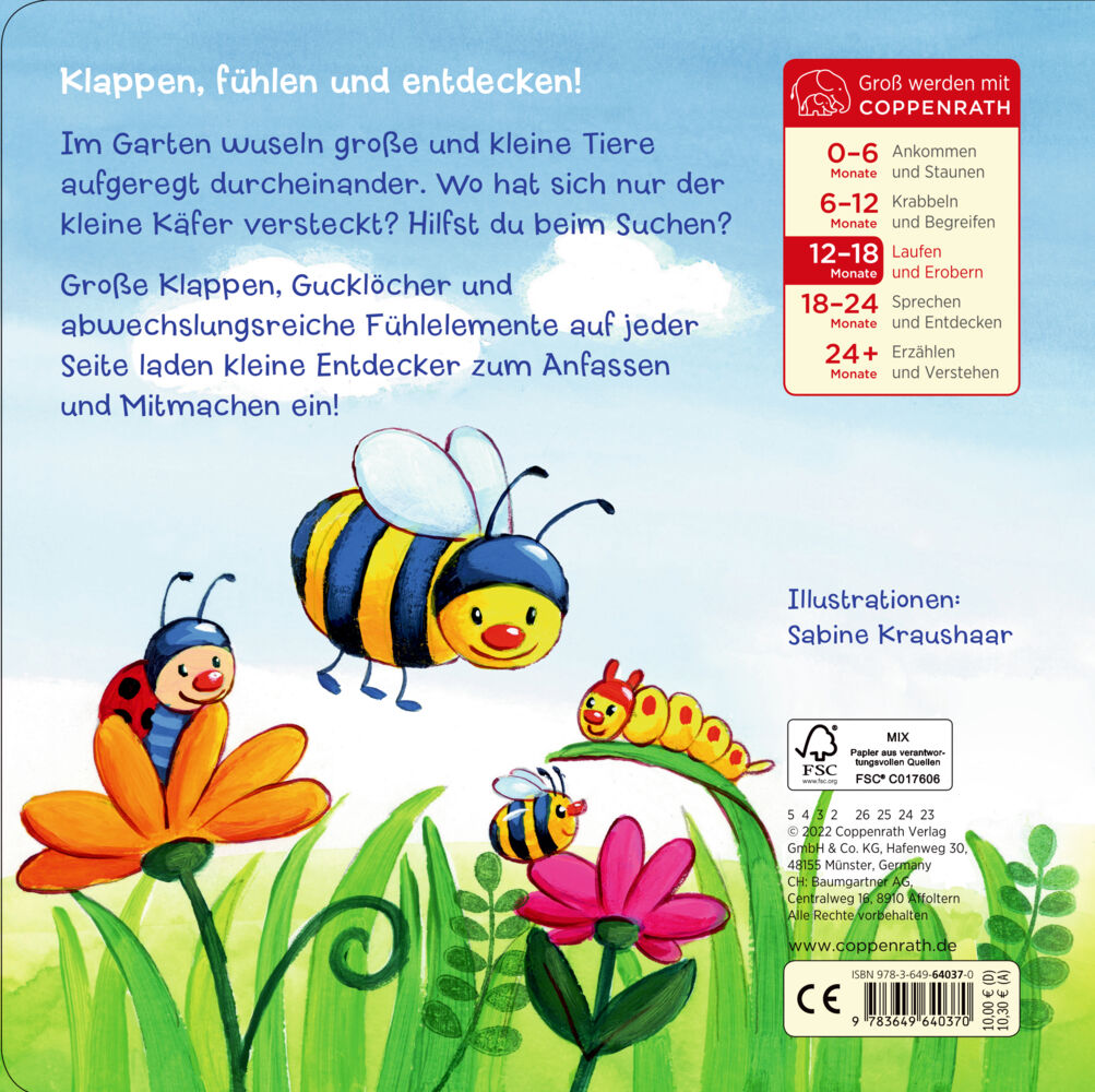 Klappen, fühlen und entdecken! Im Garten wuseln große und kleine Tiere aufgeregt durcheinander! Wo hat sich nur der kleine Käfer versteckt? Hilfst du beim Suchen? Abwechslungsreiche Fühlteile, Gucklöcher und große Klappen auf jeder Seite laden zum Anfassen und...