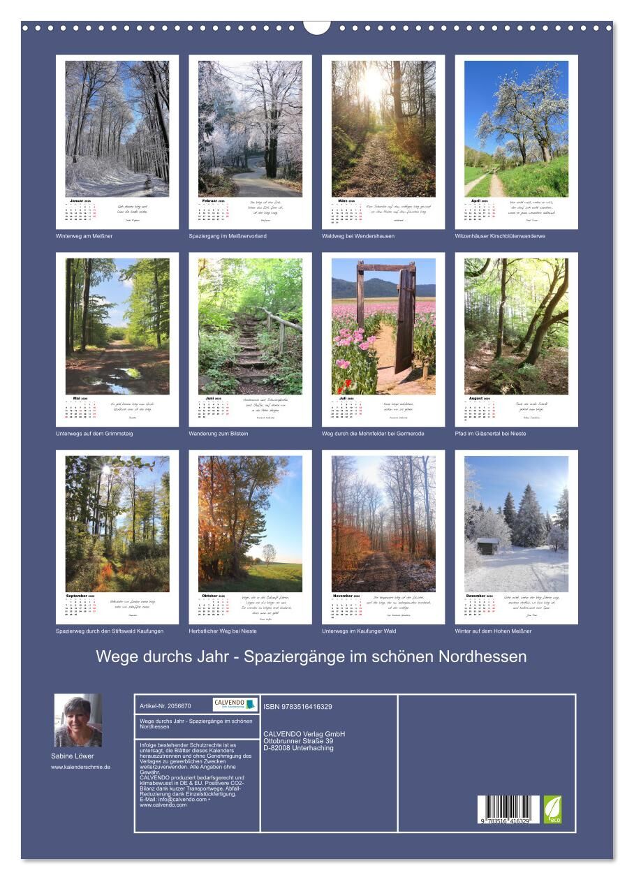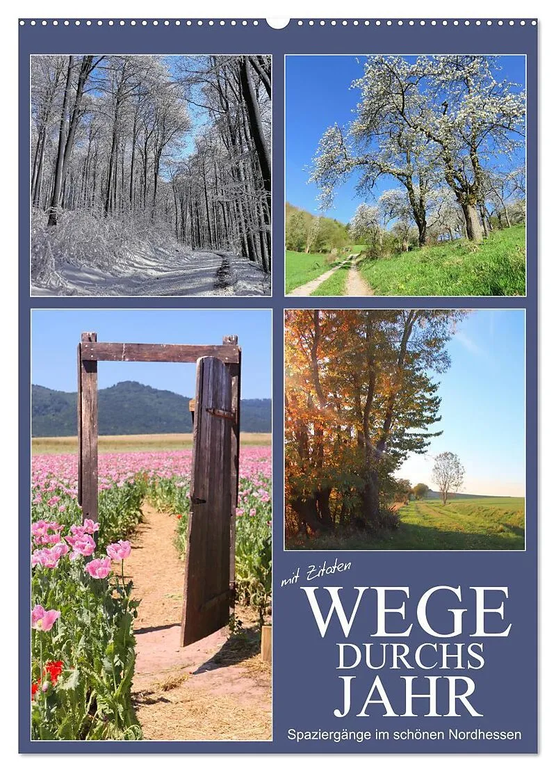Die waldreiche Mittelgebirgslandschaft in Nordhessen ist wunderschön. Die bei zahlreichen Spaziergängen aufgenommenen herrlichen Fotos sprechen für sich. Auf jedem Kalenderblatt befinden sich zudem Zitate von bekannten Zeitgenossen, die über Wege nachgedacht h...