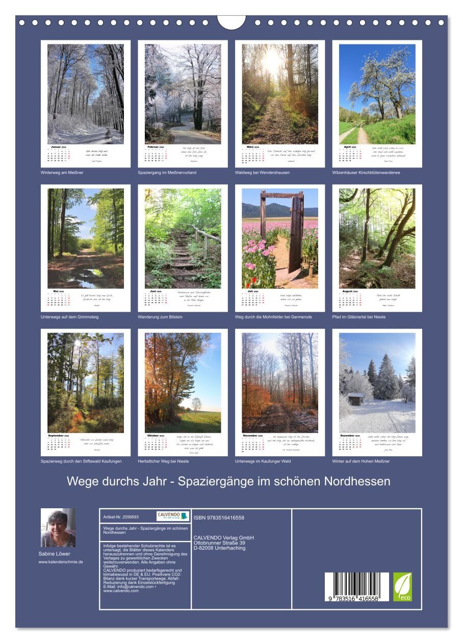 Die waldreiche Mittelgebirgslandschaft in Nordhessen ist wunderschön. Die bei zahlreichen Spaziergängen aufgenommenen herrlichen Fotos sprechen für sich. Auf jedem Kalenderblatt befinden sich zudem Zitate von bekannten Zeitgenossen, die über Wege nachgedacht h...