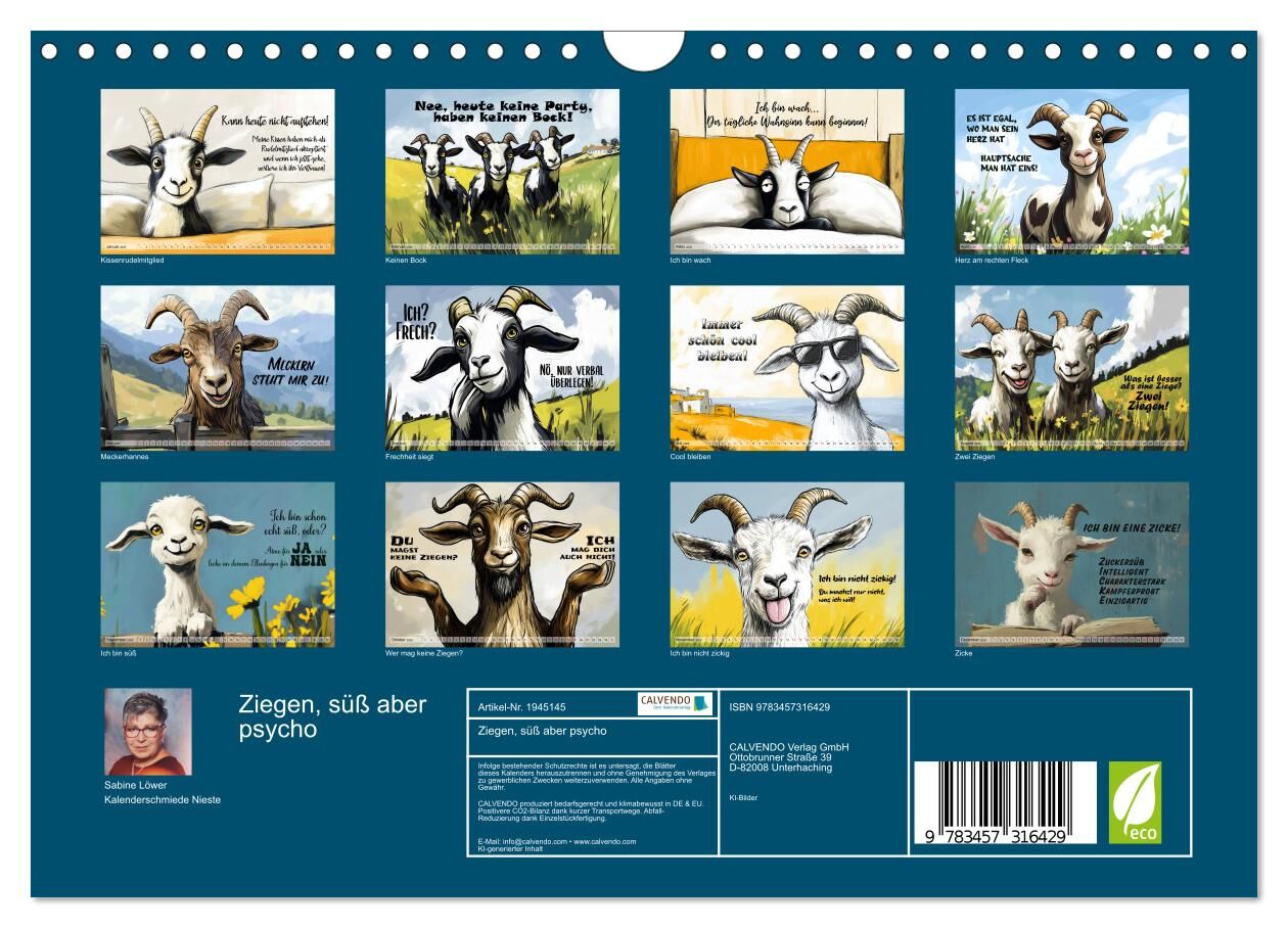 Dieser Kalender zaubert dir jeden Monat ein Lächeln ins Gesicht. Lass dich inspirieren und erlebe die Welt der Ziegen von ihrer lustigen Seite! Jeden Monat ein cooler Spruch begleitet von KI-generierten Bildern. Ob als Geschenk für dich selbst oder für einen Z...