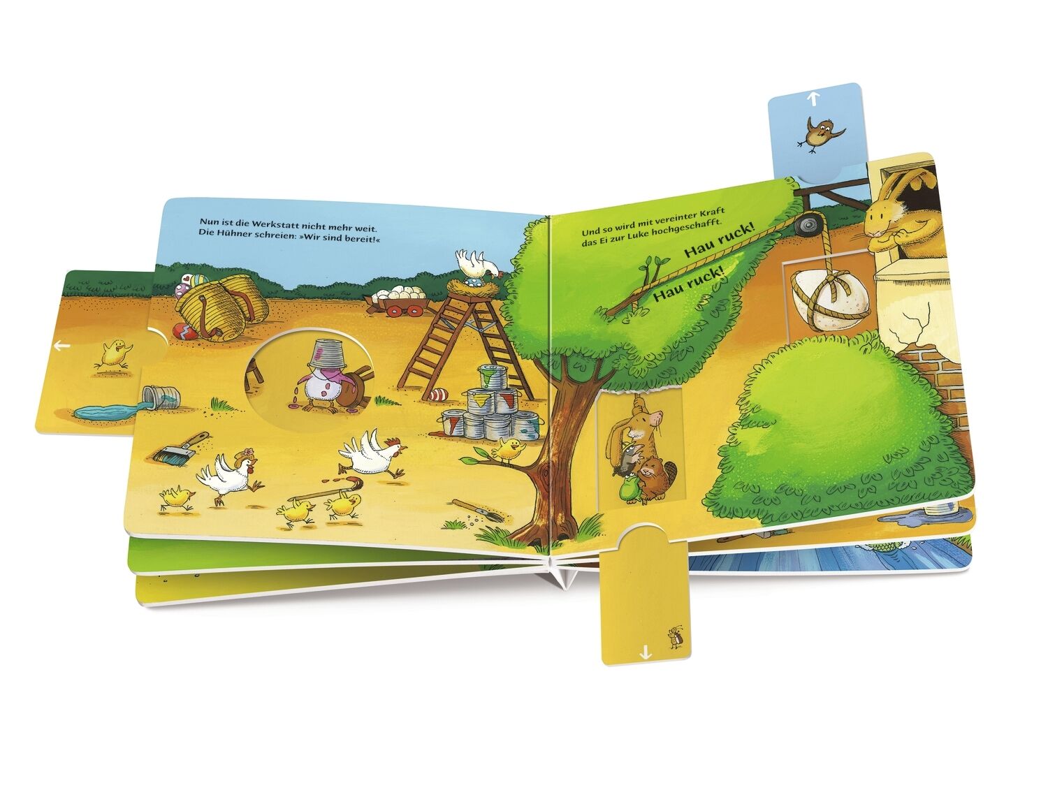 Drehen, schieben, helfen! Puh, so ein riesiges Ei! Und so ein weiter Weg bis zur Hasenwerkstatt! Doch der kleine Hase ist nicht allein. Familie Maulwurf kullert das Ei durch ihre Gänge, die Kuh lässt es weit über die Wiese fliegen und auch am Bach hilft jemand mit. Mithilfe von Schiebern und Drehscheiben sorgen die Kinder dafür, dass das Ei an sein Ziel gelangt. Wie schön, dass der Hase Hilfe hat!