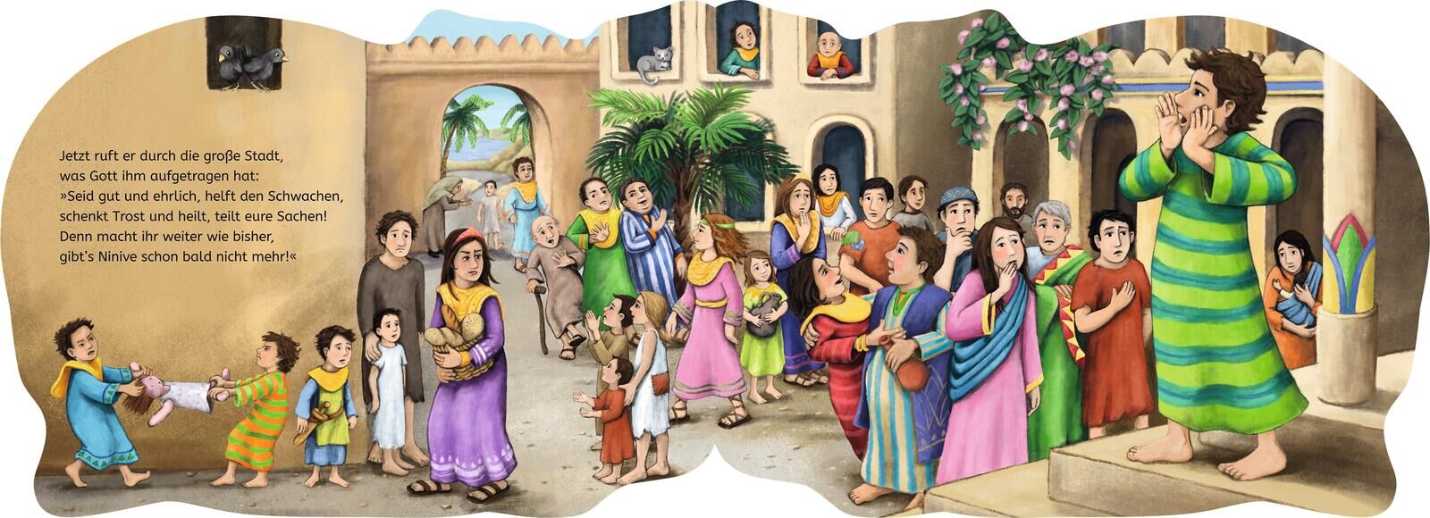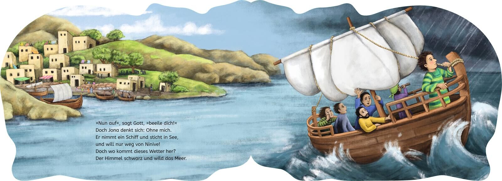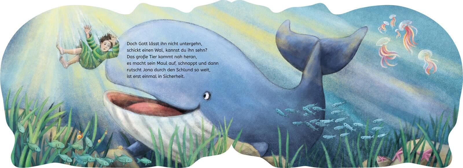 Kleines Pappbilderbuch in Form eines Wals mit der biblischen Geschichte von Jona für Kinder ab 18 Monaten geeignet Geschichte in lebendigen Reimen und liebevoll illustriert ideal als Taufgeschenk Doch Gott lässt ihn nicht untergehn, schickt einen Wal, kannst ...