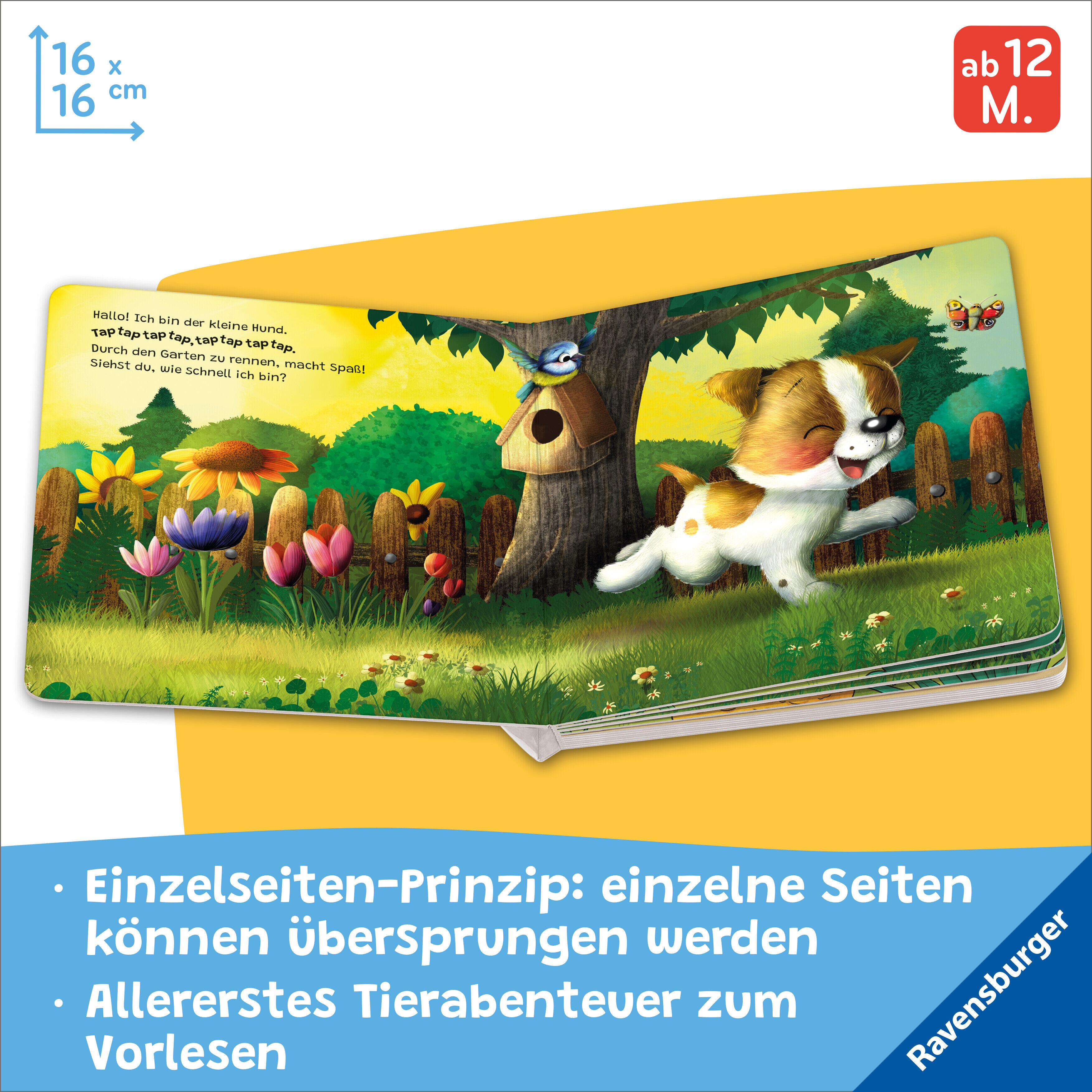 Was erlebt der kleine Hund heute? Im Garten gibt es so viel zu entdecken! Der kleine Hund rennt fröhlich umher, begrüßt einen bunten Schmetterling und beobachtet zwitschernde Vögel beim Baden. Unter einem Busch findet er einen roten Ball und jagt ihm hinterher...