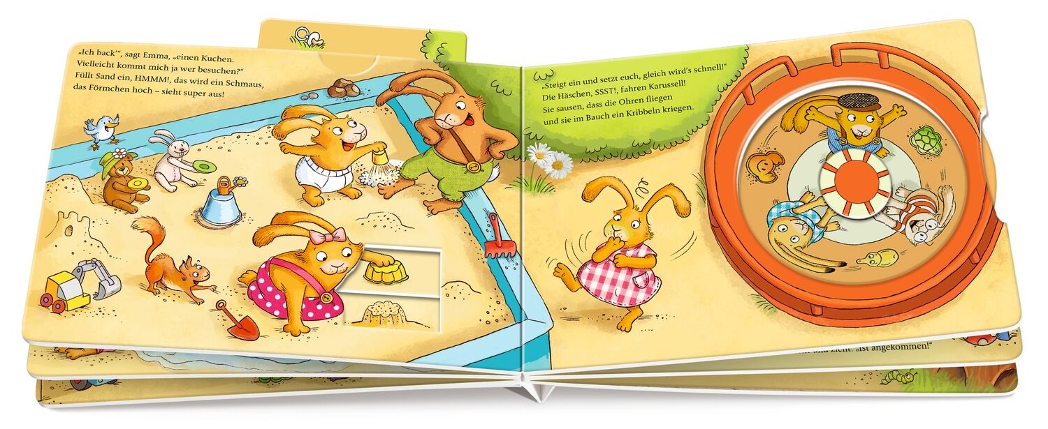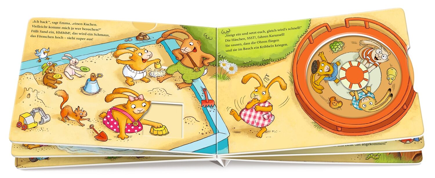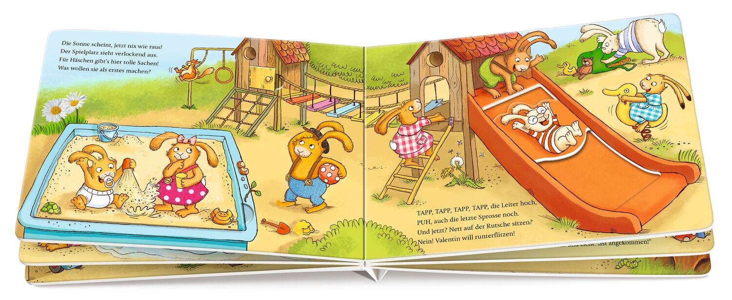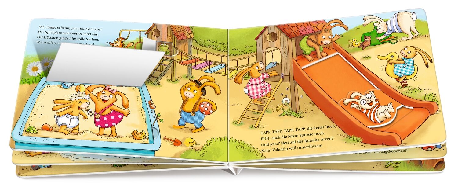 Hasenstarker Mitmachspaß auf dem Spielplatz Rutschen, klettern, wippen und Sand aus Bechern kippen: In diesem Mitmachbuch toben die sieben kleinen Hasen über den Spielplatz! Mit stabilen Schiebern und Drehelementen können Kinder ab 2 Jahren mit der Wippe wipp...