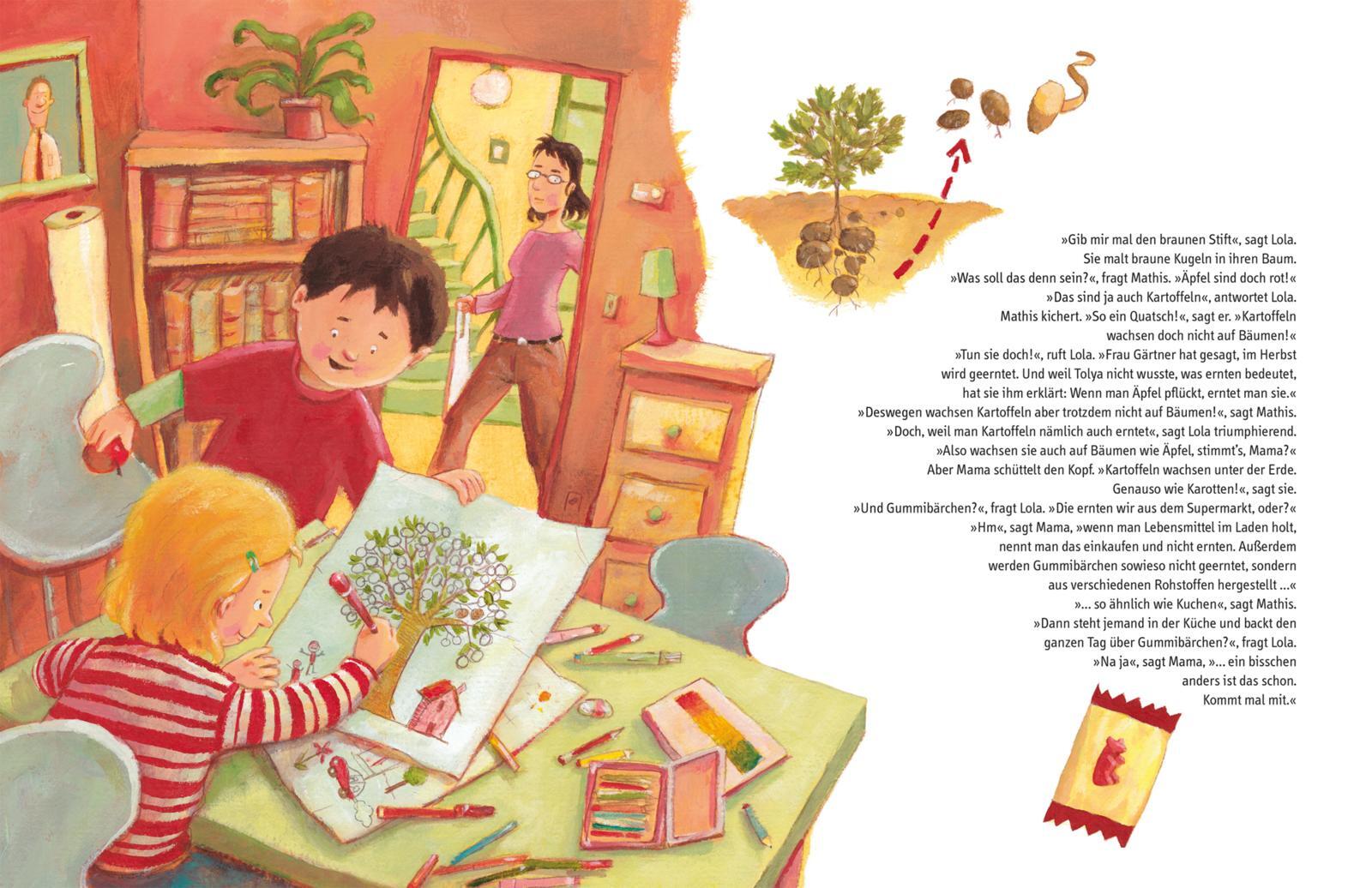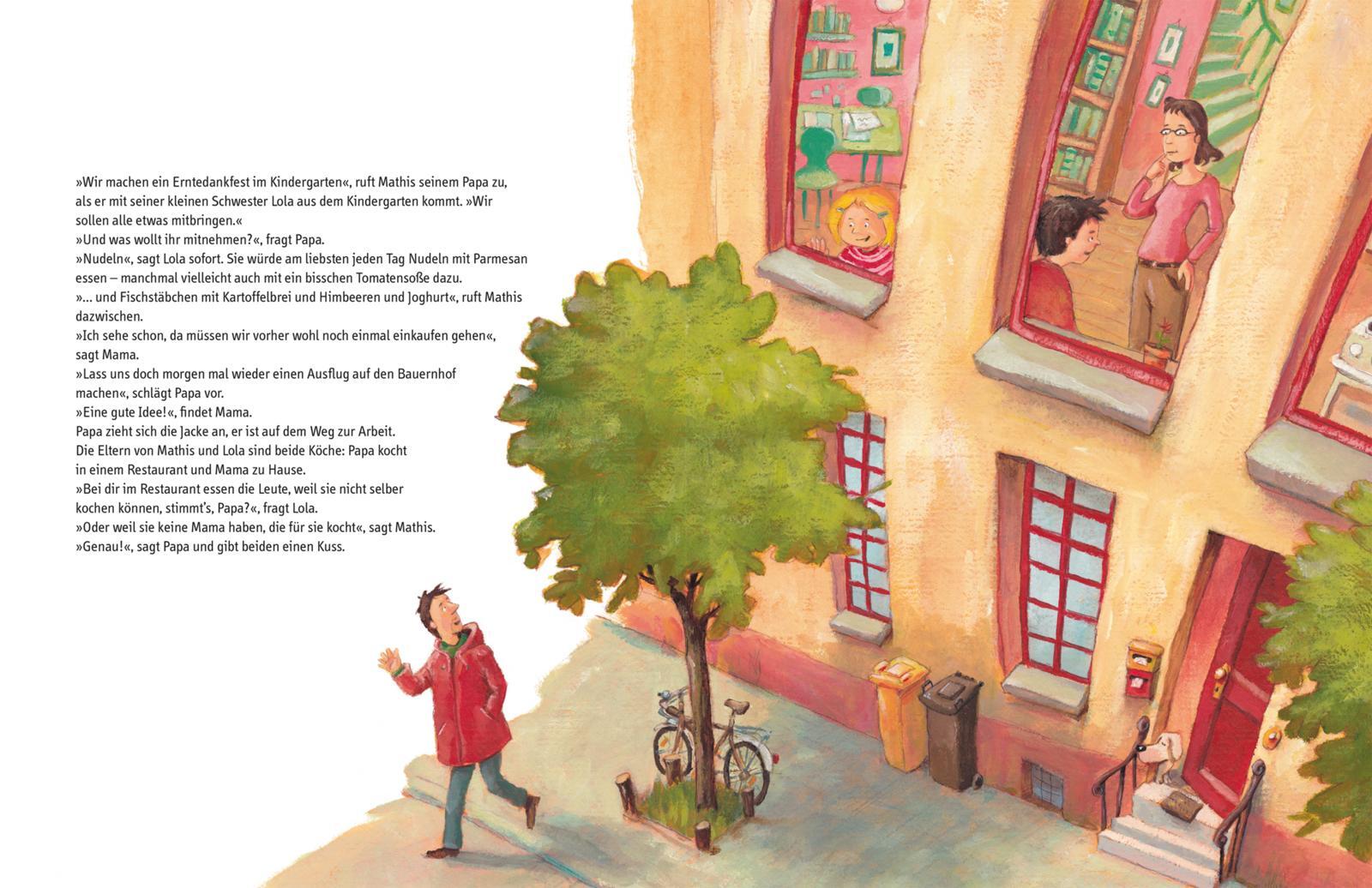 So unterhaltsam und spannend kann das Thema Ernährung sein Ein Bilderbuch für Kinder ab 4 Jahren über die Herkunft unseres Essens. Lola und Mathis bereiten im Kindergarten das Erntedankfest vor. Und da wollen sie genauer wissen, woher die Lebensmittel eigentli...