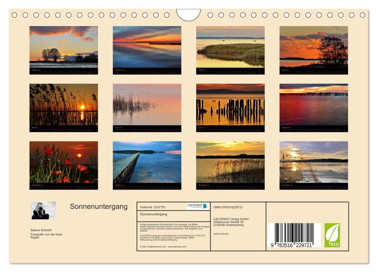 Der schönste Moment des Tages ist oft der abendliche Sonnenuntergang. In Stille und Ruhe den Tag ausklingen lassen. Dieser Kalender zeigt verschiedene schöne Stimmungen und begleitet Sie in Entspannung durch das Jahr.