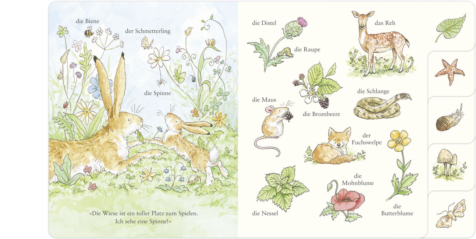 Ein Spaziergang durch die Natur - eine bezaubernd illustrierte Pappbilderbuch mit Griff-Register zum Erkennen und Benennen von Tieren und Pflanzen für Kinder ab 3 Jahren. Der kleine Hase und der große Hase sind gemeinsam unterwegs. Sie hüpfen zusammen über de...