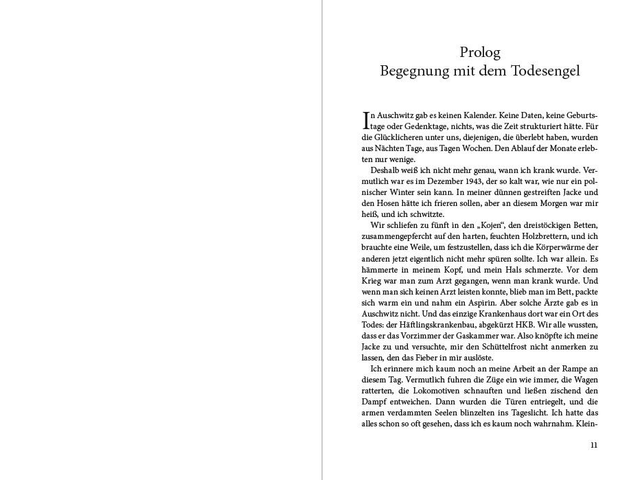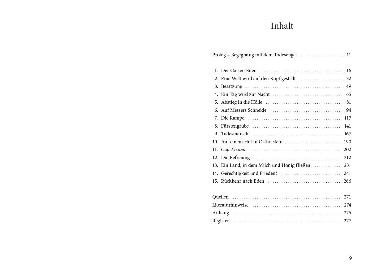 Prolog Begegnung mit dem Todesengel . . . . . . . . . . . . . . . . . . . . . 11 1. Der Garten Eden . . . . . . . . . . . . . . . . . . . . . . . . . . . . . . . . . . . . . . . 16 2. Eine Welt wird auf den Kopf gestellt . . . . . . . . . . . . . . . . . . . . . 32 3. Besatzung . . . . . . . . . . . . . . . . . . . . . . . . . . . . . . . . . . . . . . . . . . . . . 49 4. Ein Tag wird zur Nacht . . . . . . . . . . . . . . . . . . . . . . . . . . . . . . . . . 65 5. Abstieg in die Hölle . . . . . . . . . . . . . . . . . . . . . . . . . . . . . . . . . . . . 81 6. Auf Messers Schneide . . . . . . . . . . . . . . . . . . . . . . . . . . . . . . . . . . 94 7. Die Rampe . . . . . . . . . . . . . . . . . . . . . . . . . . . . . . . . . . . . . . . . . . 117 8. Fürstengrube . . . . . . . . . . . . . . . . . . . . . . . . . . . . . . . . . . . . . . . . 141 9. Todesmarsch . . . . . . . . . . . . . . . . . . . . . . . . . . . . . . . . . . . . . . . . 167 10. Auf einem Hof in Ostholstein . . . . . . . . . . . . . . . . . . . . . . . . . 190 11. Cap Arcona . . . . . . . . . . . . . . . . . . . . . . . . . . . . . . . . . . . . . . . . . . 202 12. Die Befreiung . . . . . . . . . . . . . . . . . . . . . . . . . . . . . . . . . . . . . . . . 212 13. Ein Land, in dem Milch und Honig fließen . . . . . . . . . . . . 231 14. Gerechtigkeit und Frieden? . . . . . . . . . . . . . . . . . . . . . . . . . . . 241 15. Rückkehr nach Eden . . . . . . . . . . . . . . . . . . . . . . . . . . . . . . . . . 266 Quellen . . . . . . . . . . . . . . . . . . . . . . . . . . . . . . . . . . . . . . . . . . . . . . . . . 271 Literaturhinweise . . . . . . . . . . . . . . . . . . . . . . . . . . . . . . . . . . . . . . . . 274 Anhang . . . . . . . . . . . . . . . . . . . . . . . . . . . . . . . . . . . . . . . . . . . . . . . . . 275 Register . . . . . . . . . . . . . . . . . . . . . . . . . . . . . . . . . . . . . . . . . . . . . . . . . 277