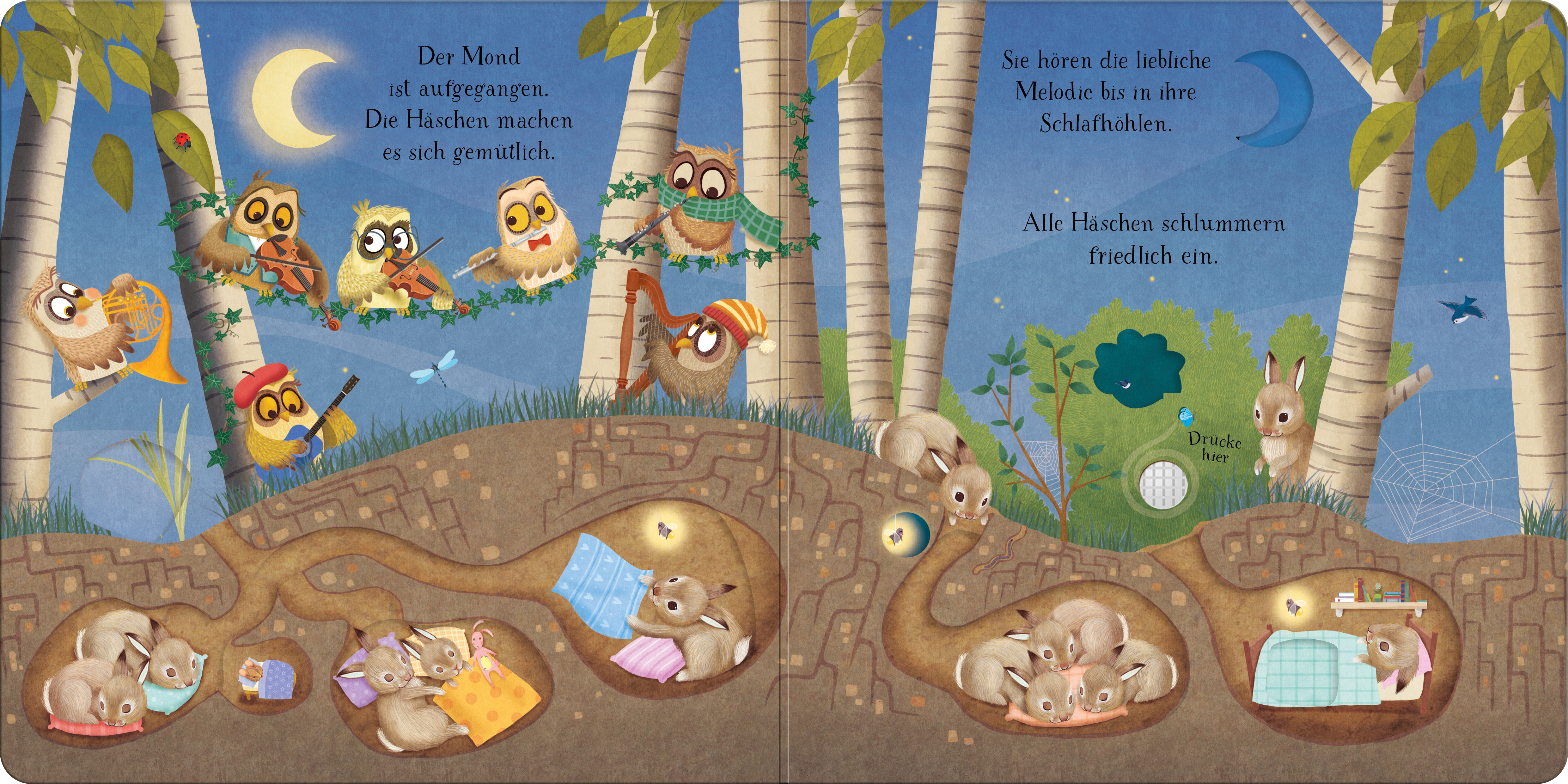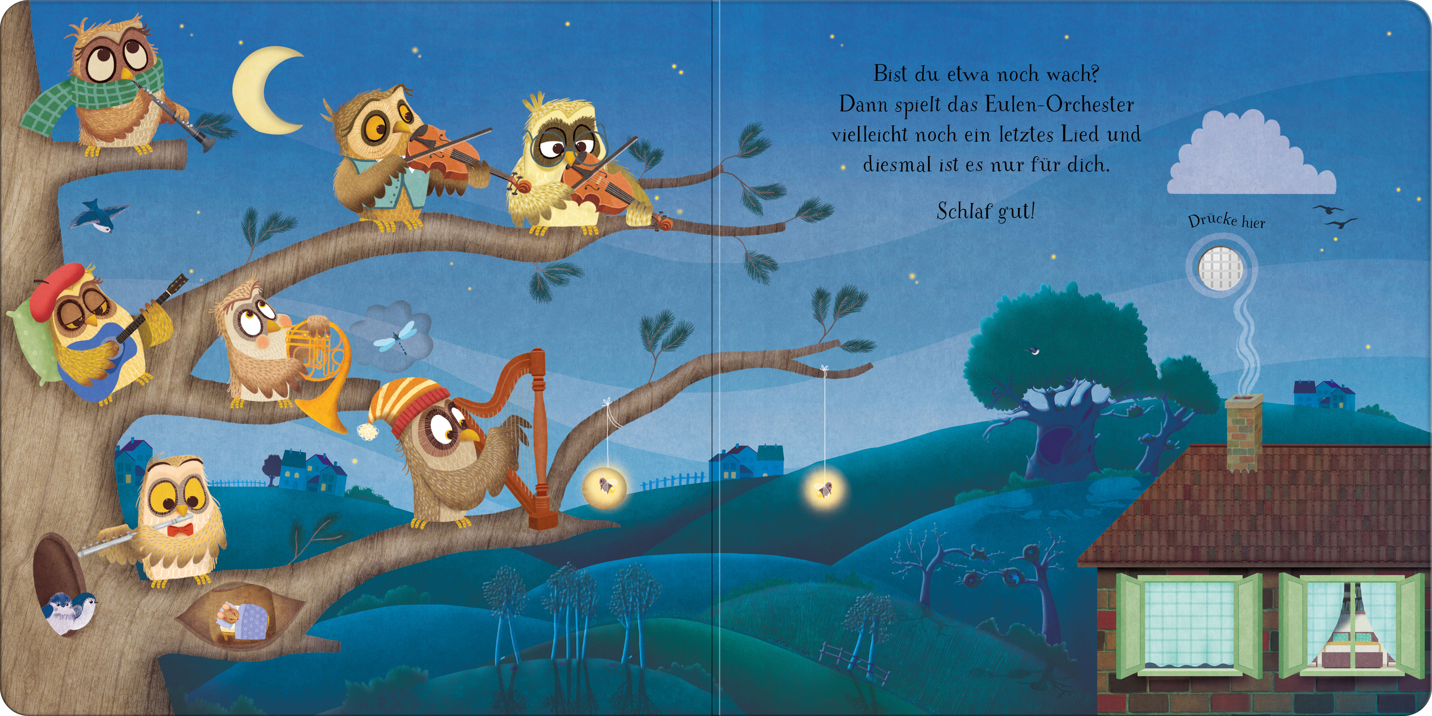 Zur Schlafenszeit gibt das Eulen-Orchester für alle Tierkinder und dich ein Gute-Nacht-Konzert. Fünf bekannte Schlaflieder mit Melodien von Brahms, Mozart, Schubert, Chopin und Fauré begleiten dich ins Land der Träume. Mit einem leicht zu bedienenden Soundchip...