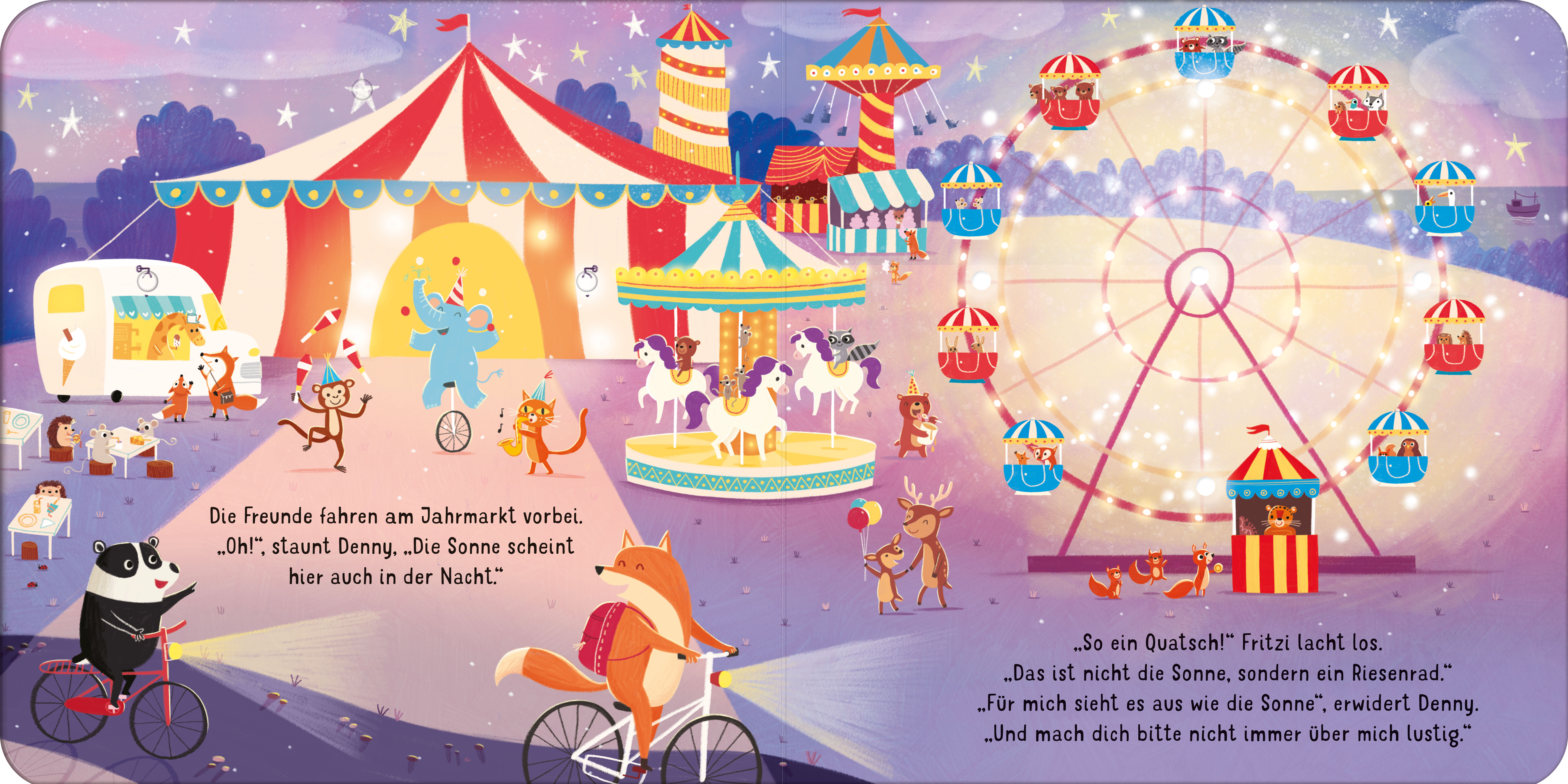 Die Stadt bei Nacht ist ganz anders als der Wald. Das muss auch Denny Dachs feststellen, als er Fritzi Fuchs besuchen kommt. Und Fritzi muss lernen, dass man seine Freunde nicht auslacht, wenn sie etwas nicht kennen. Entdecke strahlende Lichter auf jeder Seite...