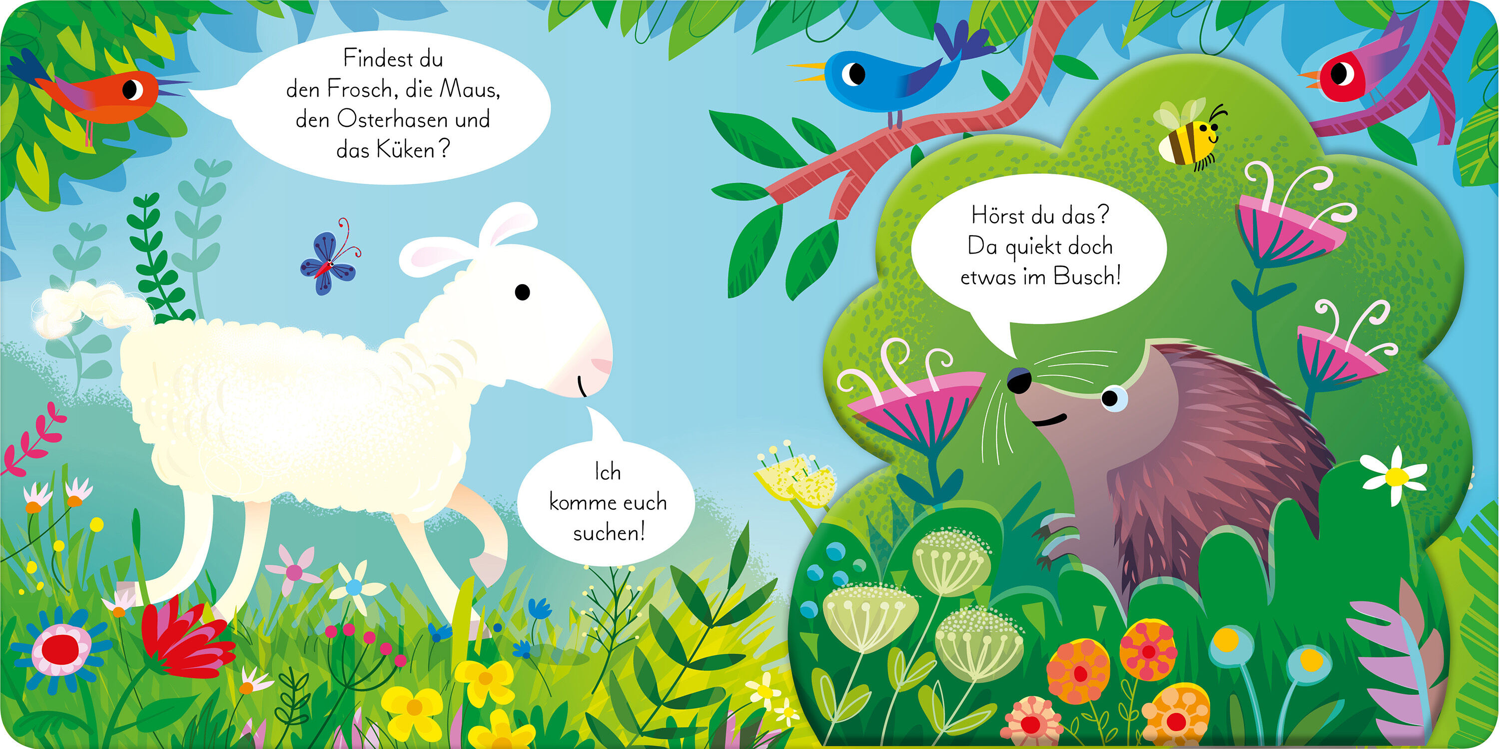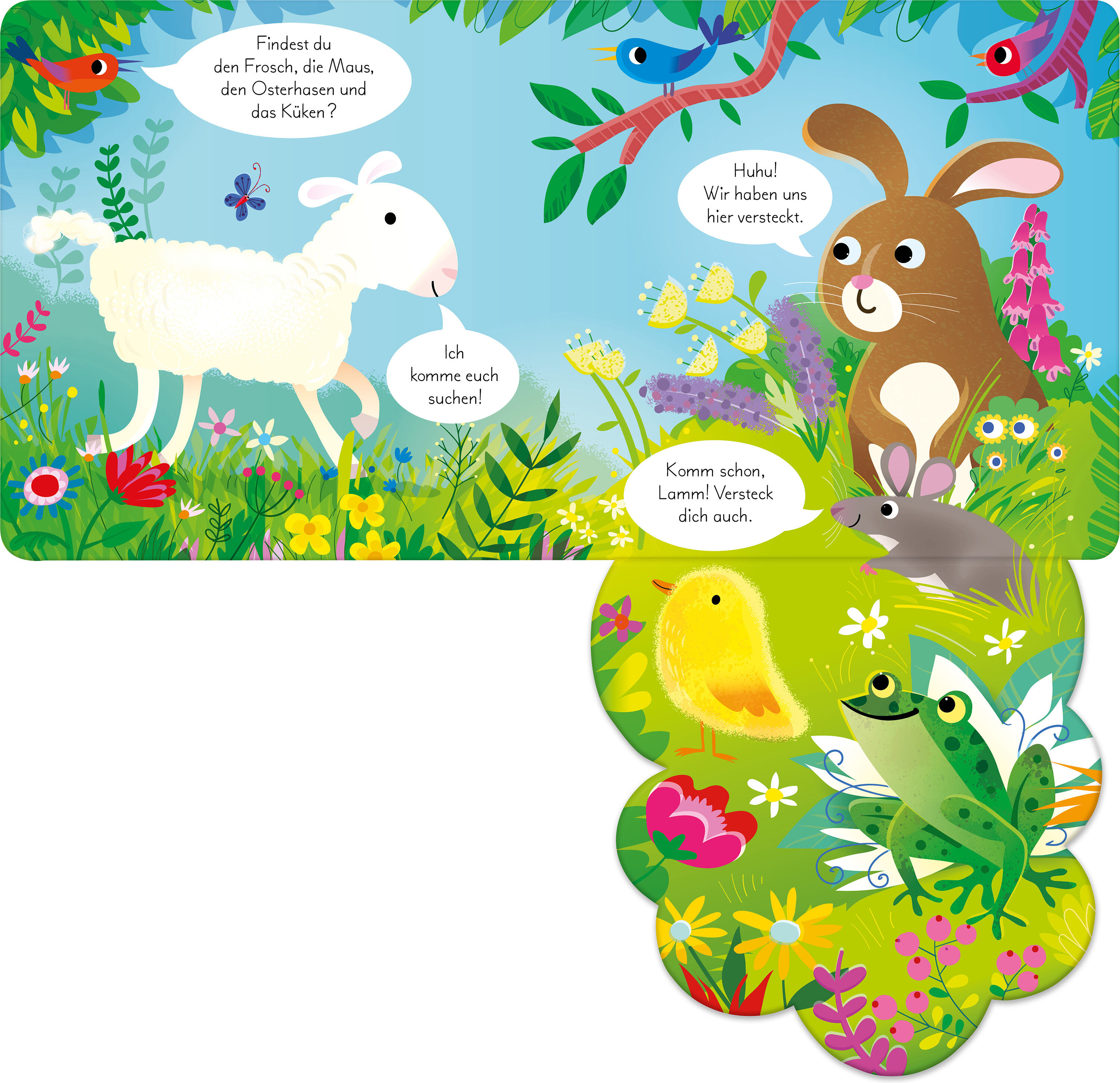 Hilf dem Osterhasen, alle seine Freunde zu finden! Entdeckst du Küken, Maus, Frosch und Lamm hinter den dichten Blättern und unter den extragroßen Klappen? Ein aufregendes Such-Abenteuer für die Kleinsten. Auf Entdeckungsreise durch den Wald Hilf dem Osterhase...