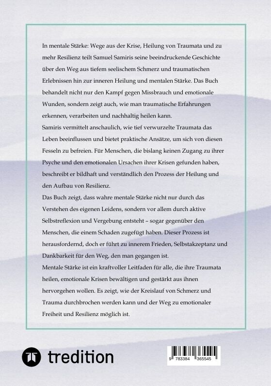 Buchbeschreibung: In mentale Stärke: Wege aus der Krise, Heilung von Traumata und zu mehr Resilienz teilt Samuel Samiris seine beeindruckende Geschichte über den Weg aus tiefem seelischem Schmerz und traumatischen Erlebnissen hin zur inneren Heilung und mental...
