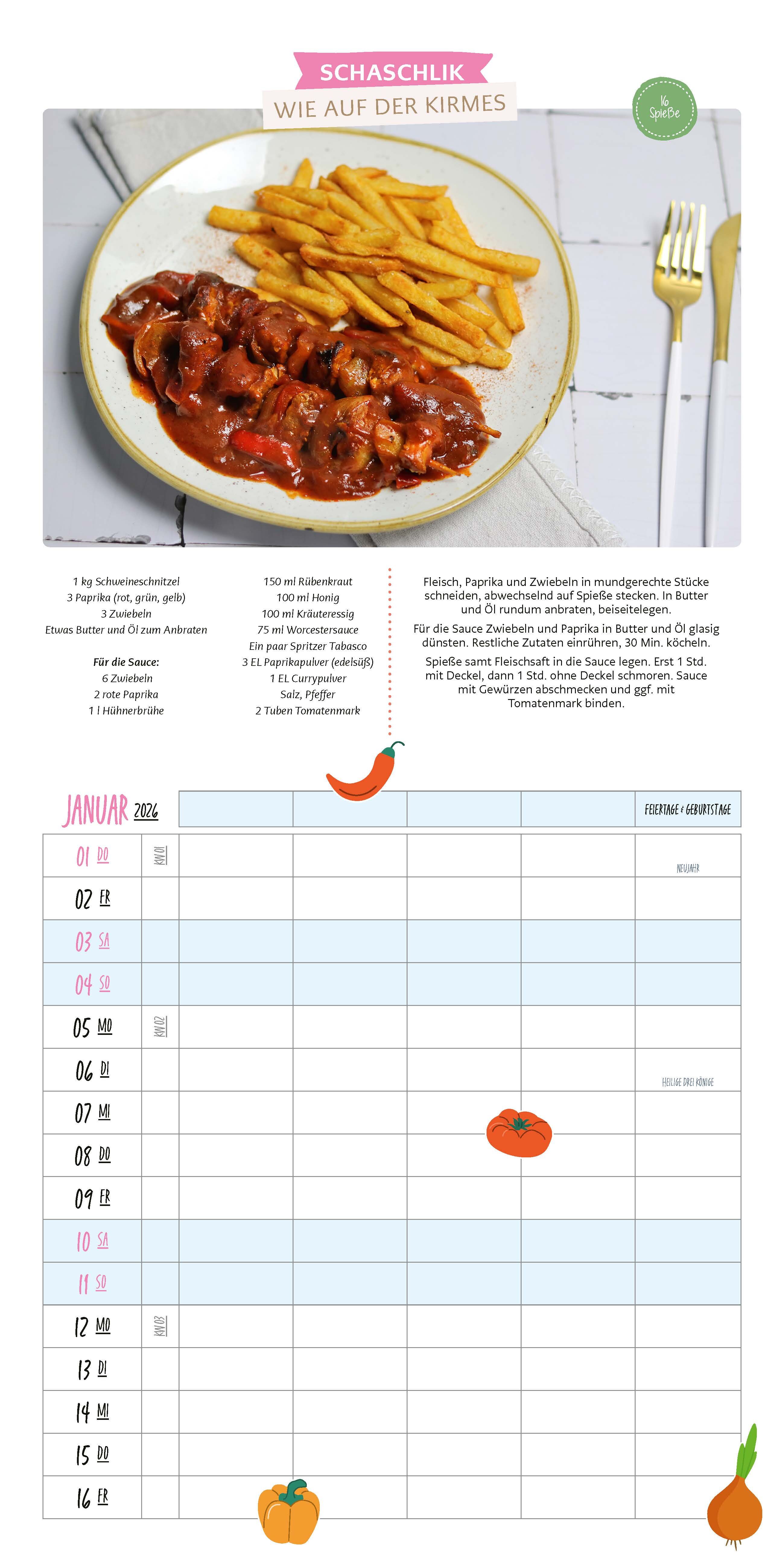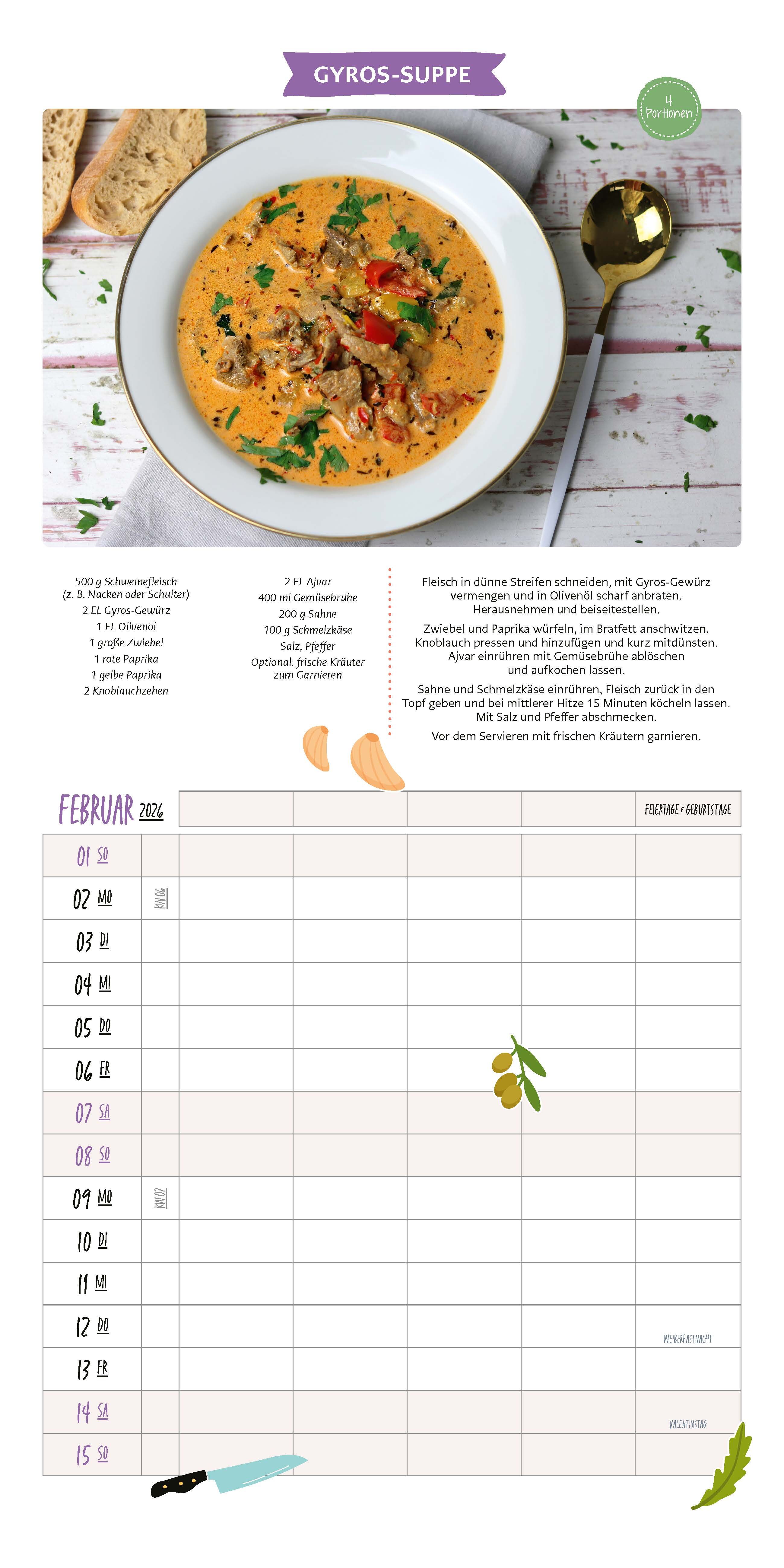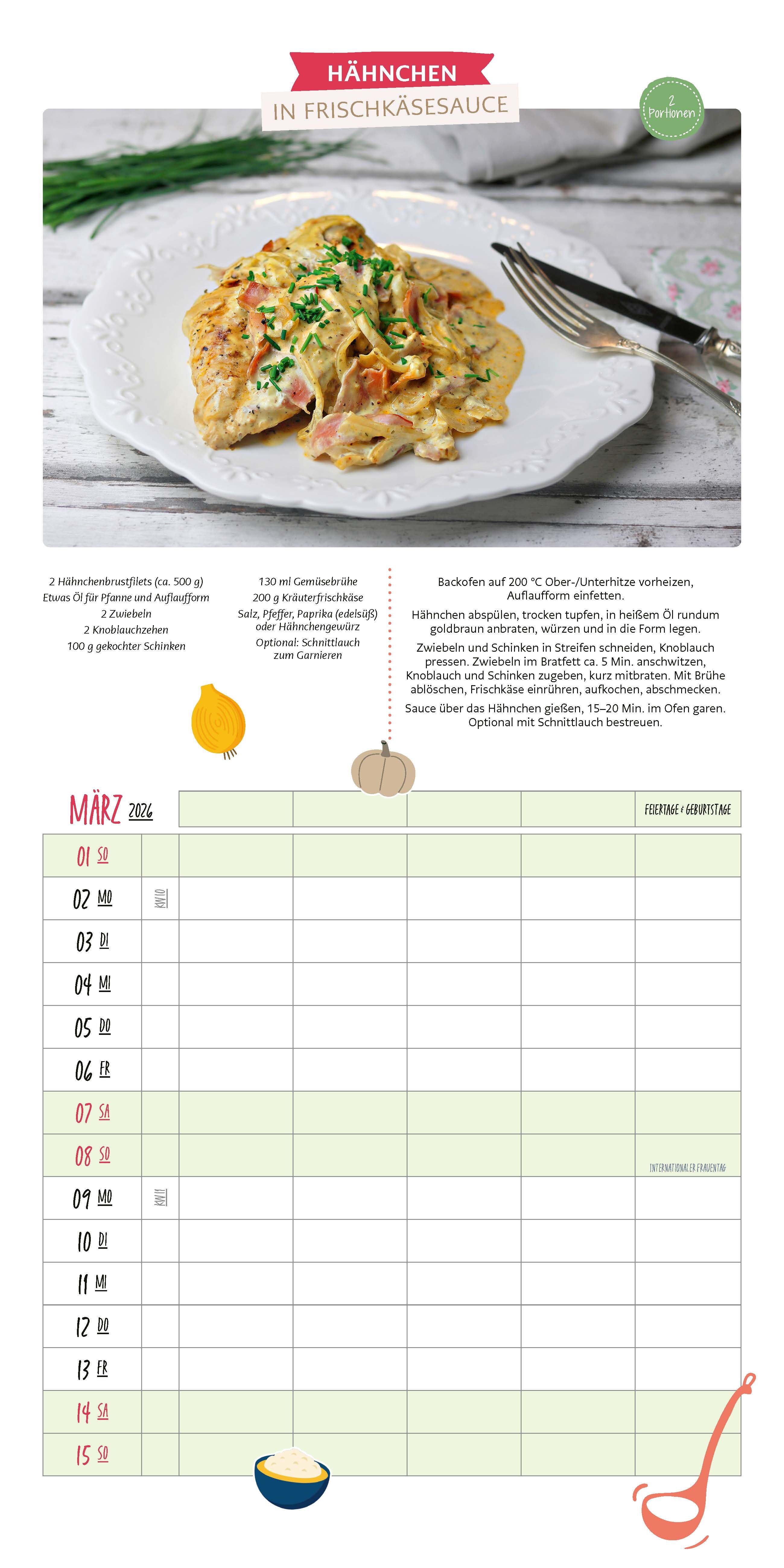 Dieser Familienplaner 2026 ist ein wunderbarer Jahresbegleiter in der Küche! Begleitet von liebevoller Foodfotografie hat Erfolgsbloggerin und SPIEGEL-Bestseller-Autorin Sandra Franitza 24 ihrer leckersten Rezepte zusammengestellt - pro Monat ein süßes und ein...