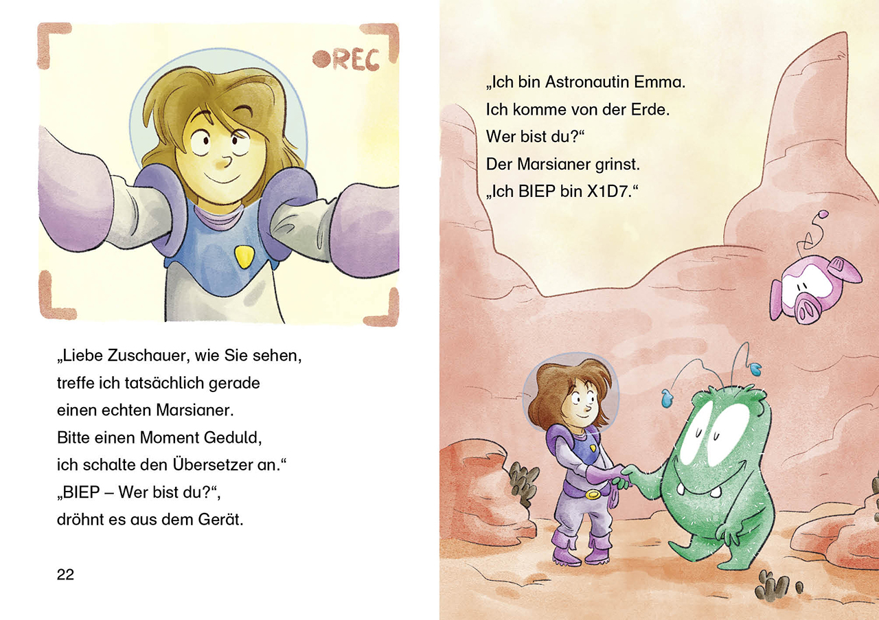 mit Spotlack und Stickerbogen Kurz nach dem Start stellt Astronaut Marc fest, dass ein Meteorit auf die Rakete zurast. Dann fällt auch noch der Funkkontakt zur Erde aus. Ob das gut geht? Auch Emma ist aufgeregt. In einer Höhle auf dem Mars hat sie einen Außeri...