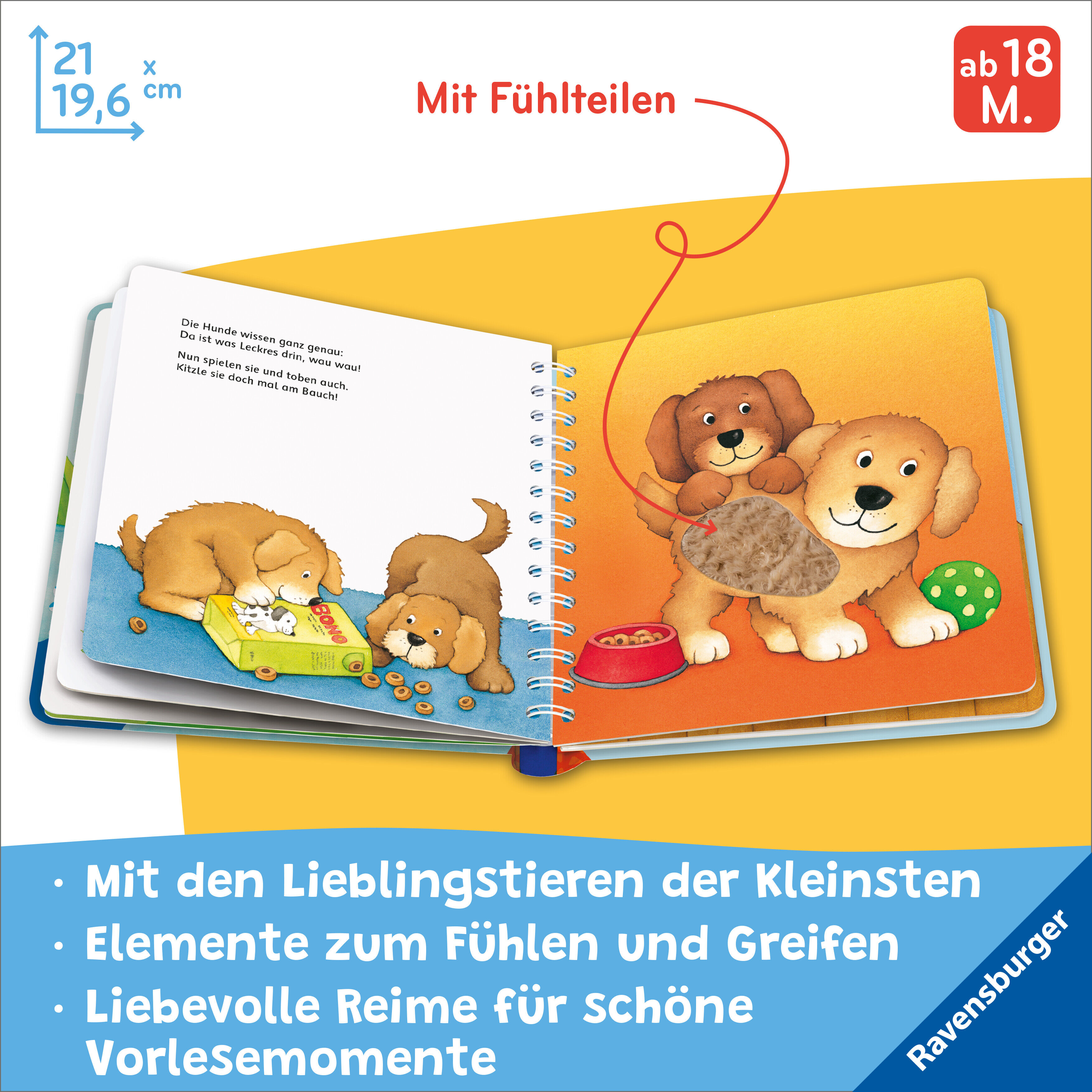 Extragroßer Fühlspaß für kleine Kinderhände! In diesem Buch können Kleinkinder ihren liebsten Tieren ganz nah kommen und sie ausgiebig streicheln. Begleitet von kurzen Reimen ist dieses Fühlbuch perfekt für jede Tageszeit. Dank der Spiralbindung bleibt das Buc...