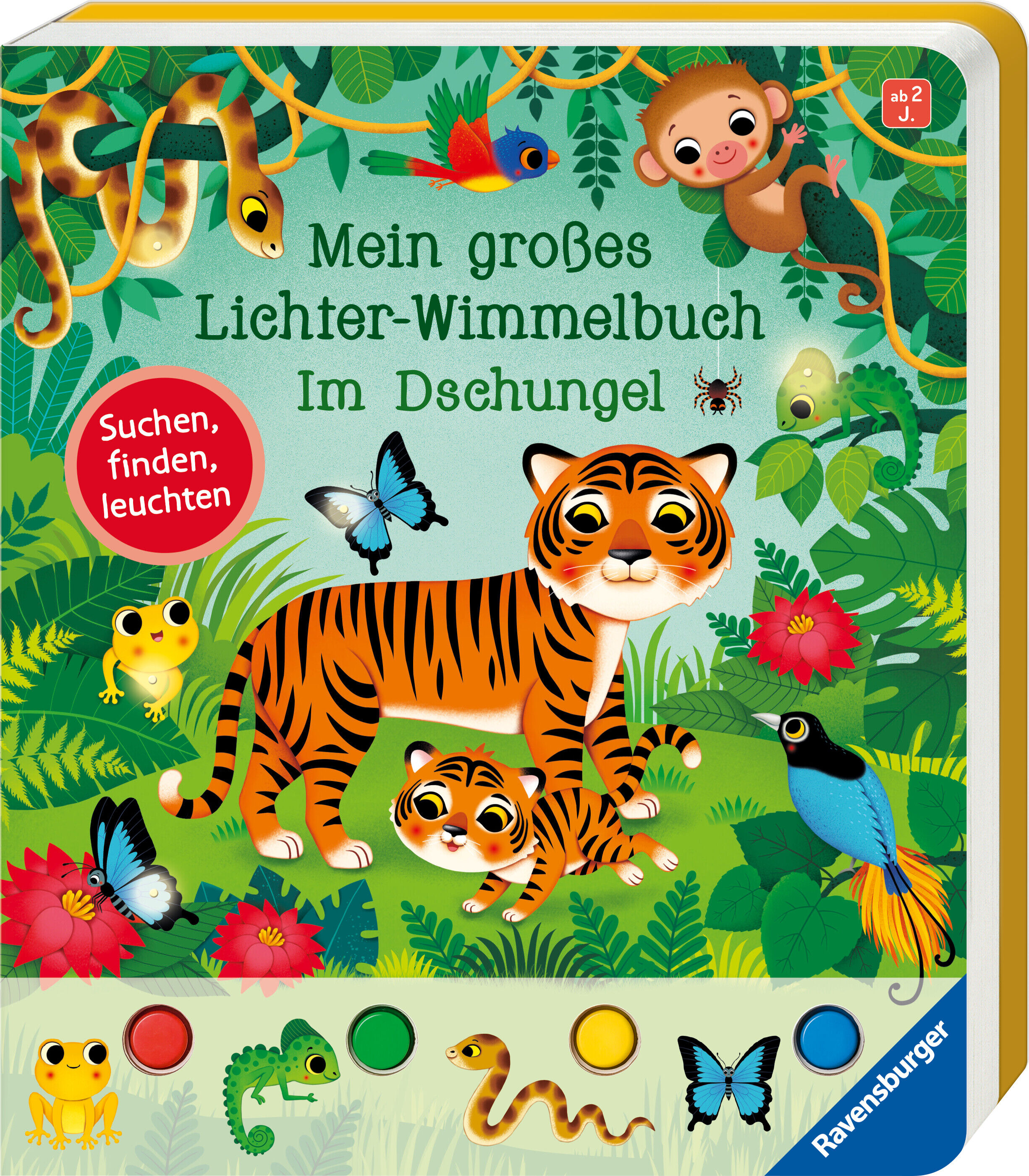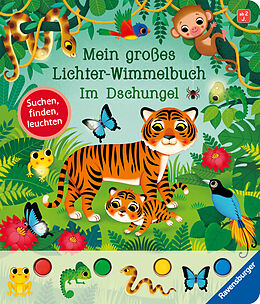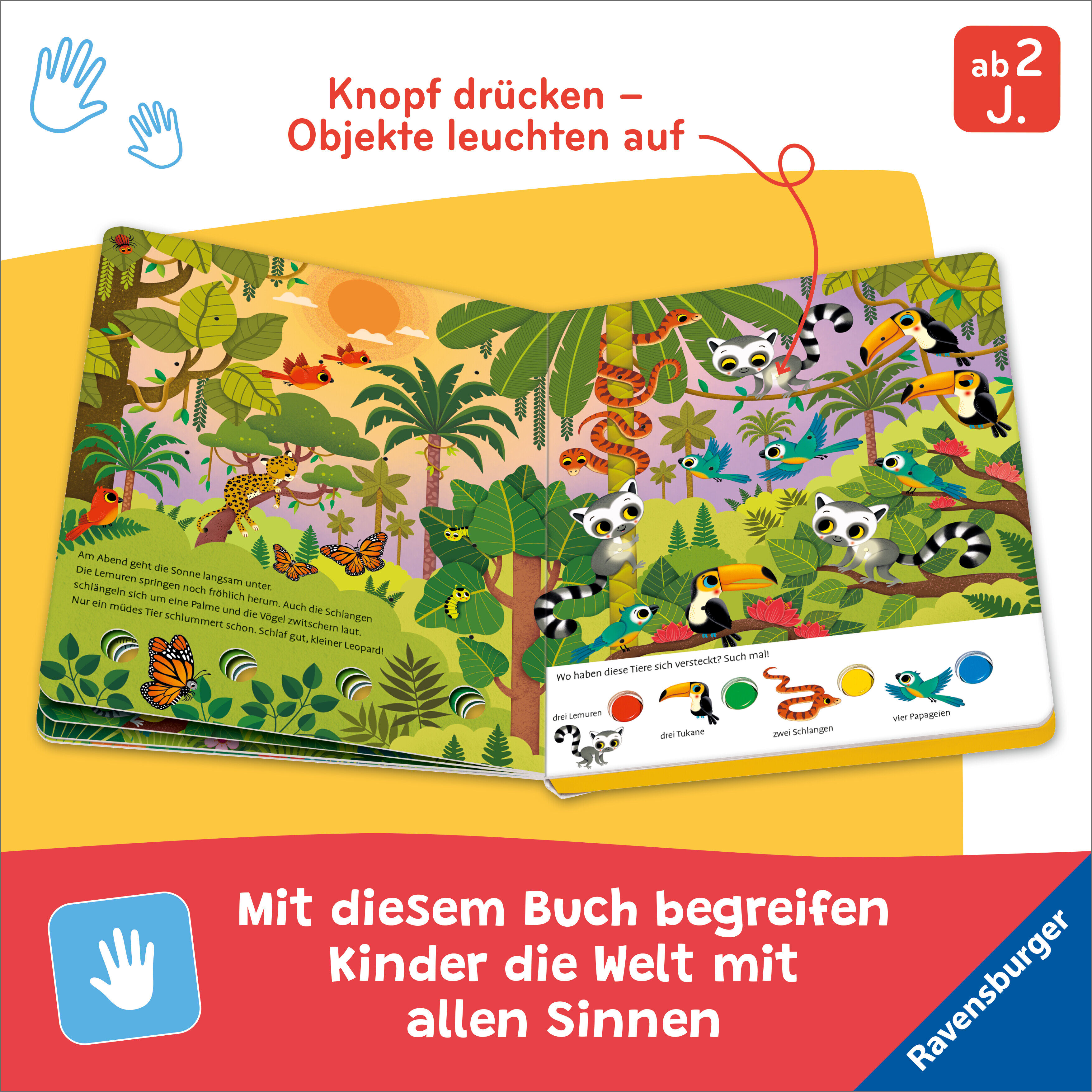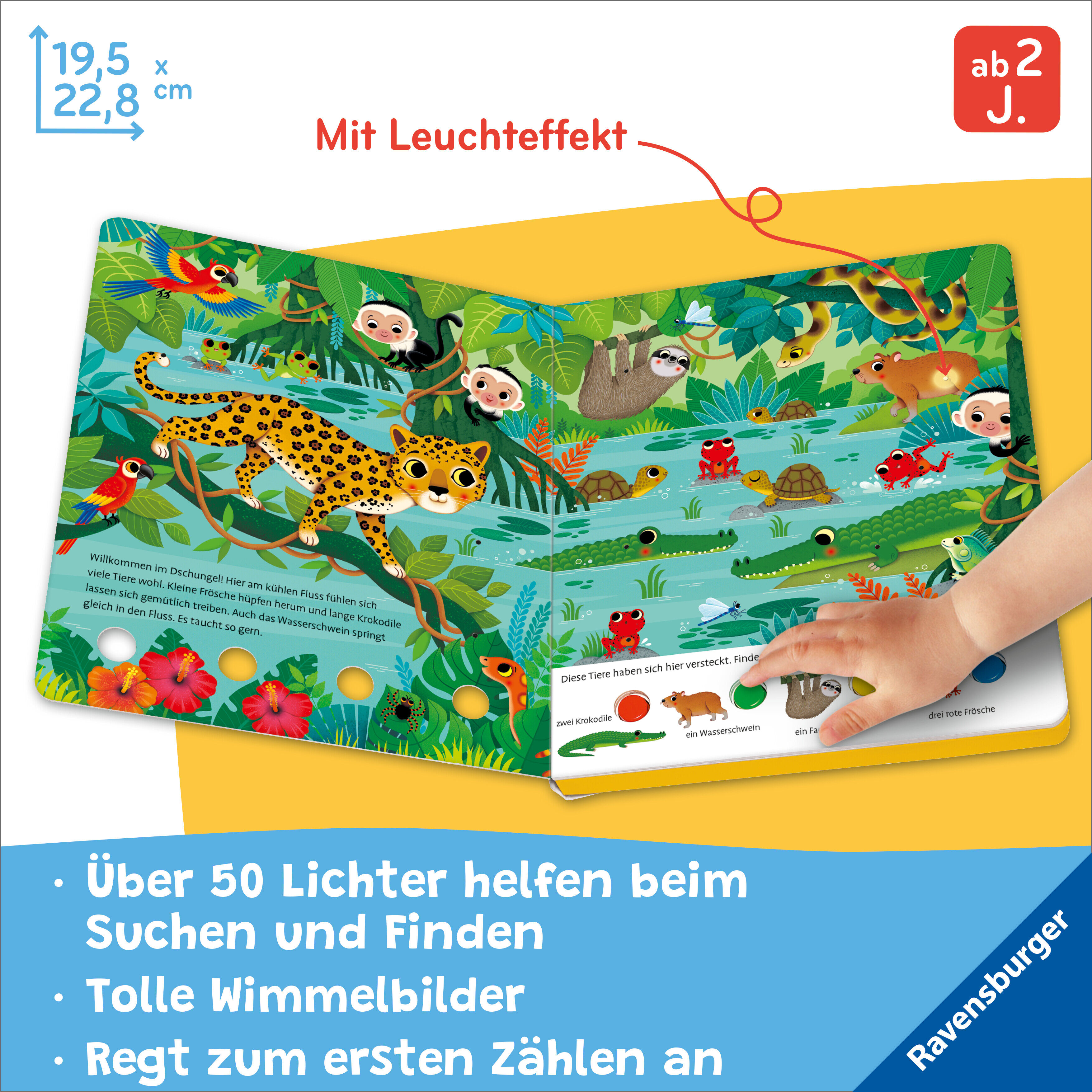 Mit vielen Lichtern den Dschungel und seine Tiere entdecken! Im Dschungel ist immer viel los: Die Tiger streifen durch die Büsche, die Papageien krächzen hoch oben in den Bäumen und die Äffchen schwingen von Liane zu Liane. Kannst du sie alle finden? Die Licht...