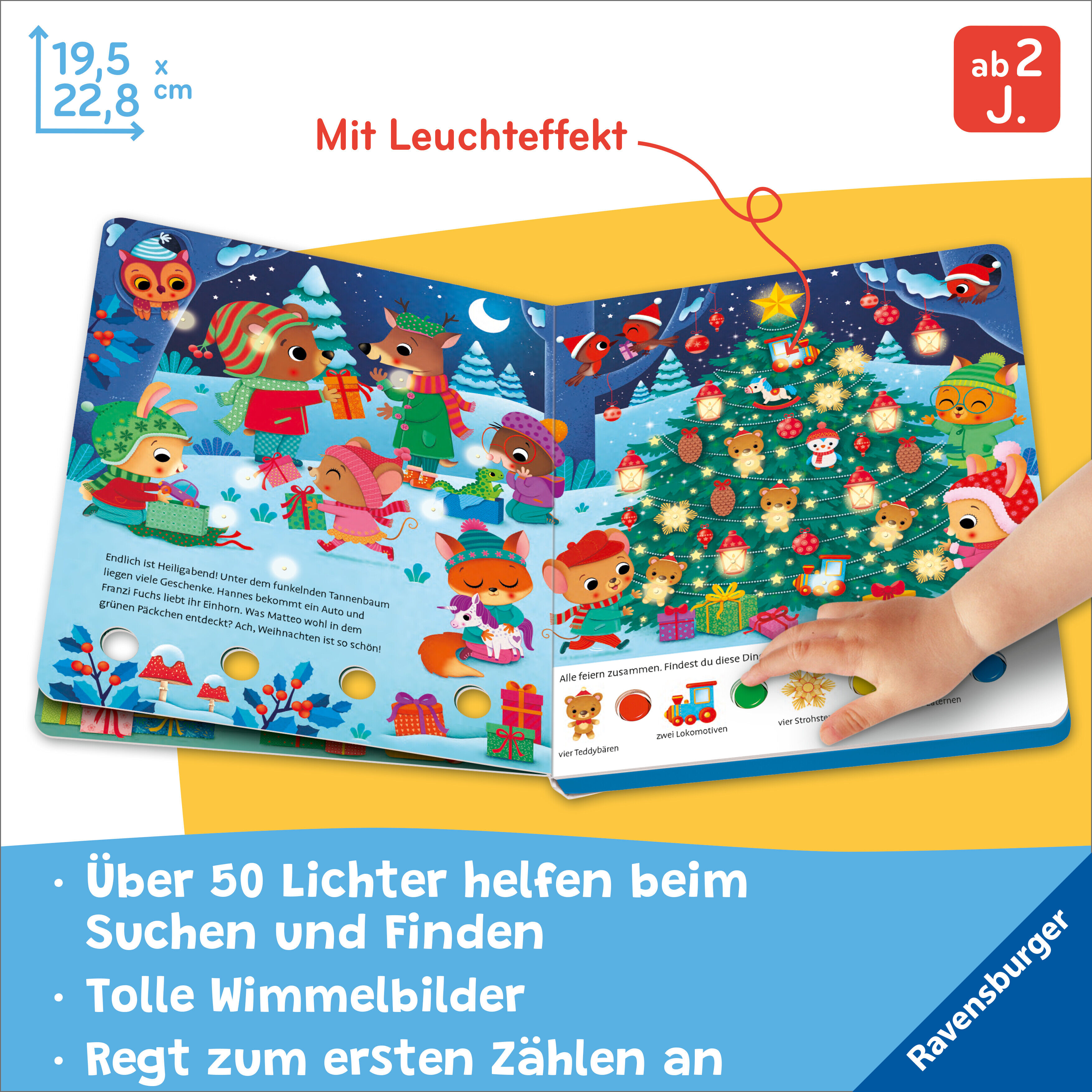 Mit Lichtern Weihnachten feiern bei Familie Maus! Überall wimmelt es. Alle sind mit den Weihnachtsvorbereitungen beschäftigt! Kannst du alle Sterne, Mützen und Weihnachtsmänner finden? Die Lichter helfen dir dabei! Einfach auf den Knopf drücken und die Lichter...