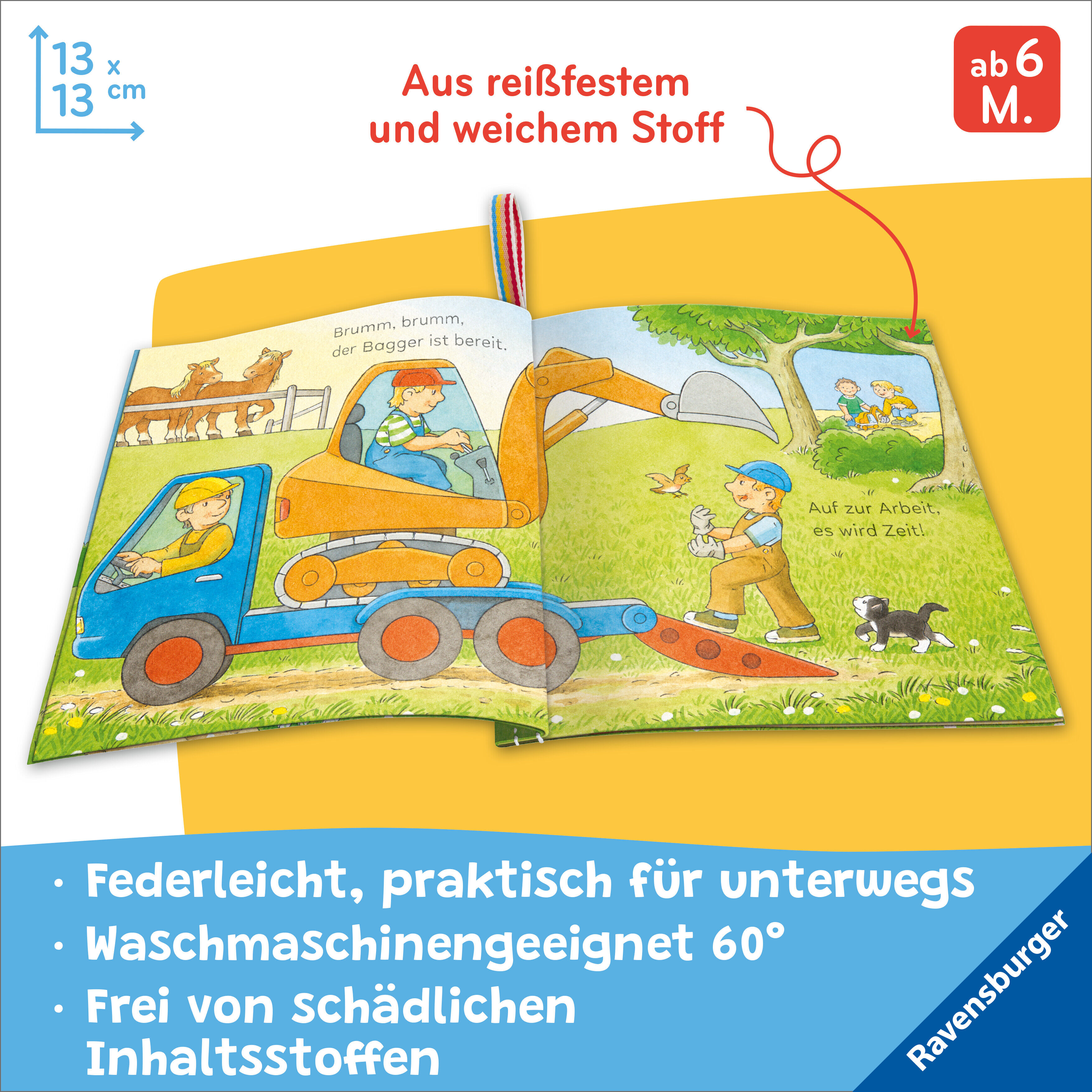 Stoffbuch zum Kuscheln, Knabbern und Baden Auf der Baustelle ist was los! Begleite den Bagger bei seiner Arbeit. Ein kuschelstarkes Buch für jede Gelegenheit! Dieses federleichte Stoffbuch für Kinder ab 6 Monaten kommt mit ins Bett, in den Sandkasten, in die B...