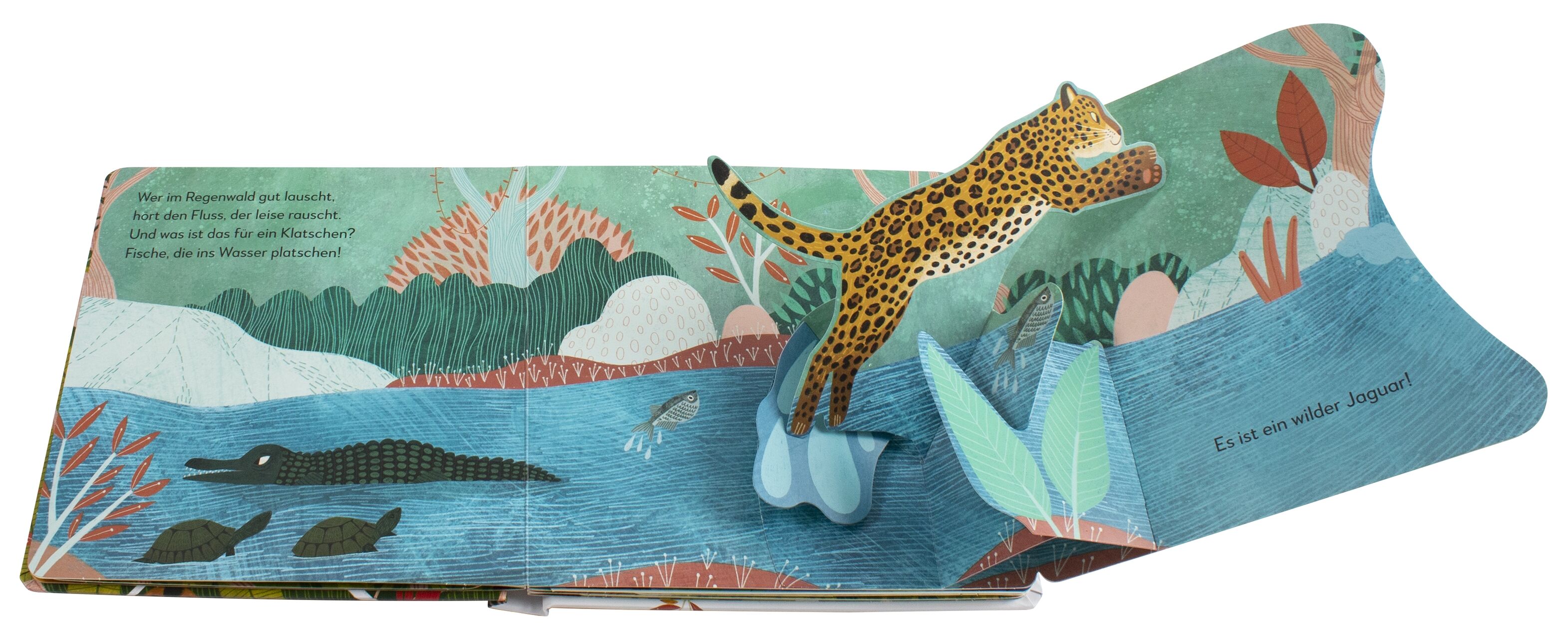 Regenwald zum Anfassen für die ganz Kleinen! Auf ganz wunderbare Weise regt dieses Kinderbuch ab 2 die Fantasie von Kleinkindern an: Das hochwertige Pappbilderbuch zeigt in 5 eindrucksvoll großen 3-D-Pop-ups wilde Tiere im dichten Dschungel. Schöne Reime lade...