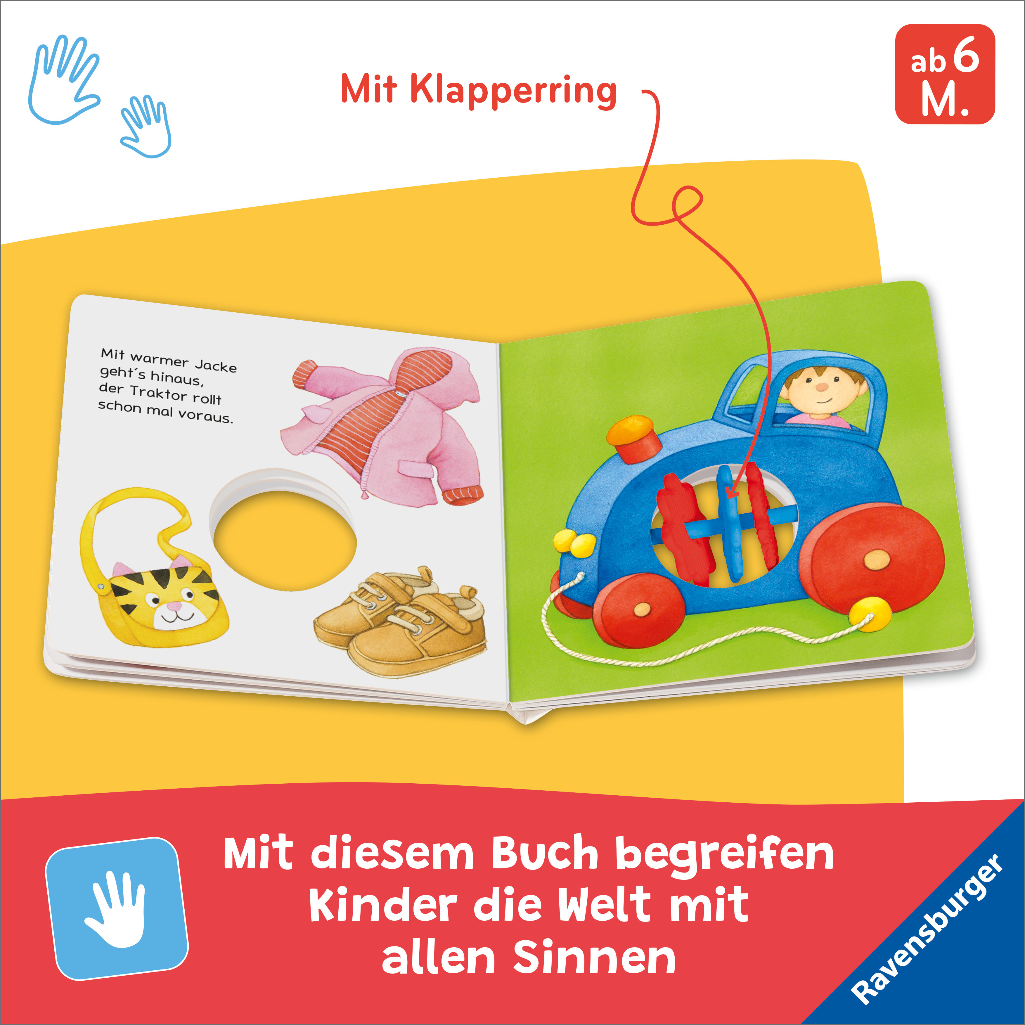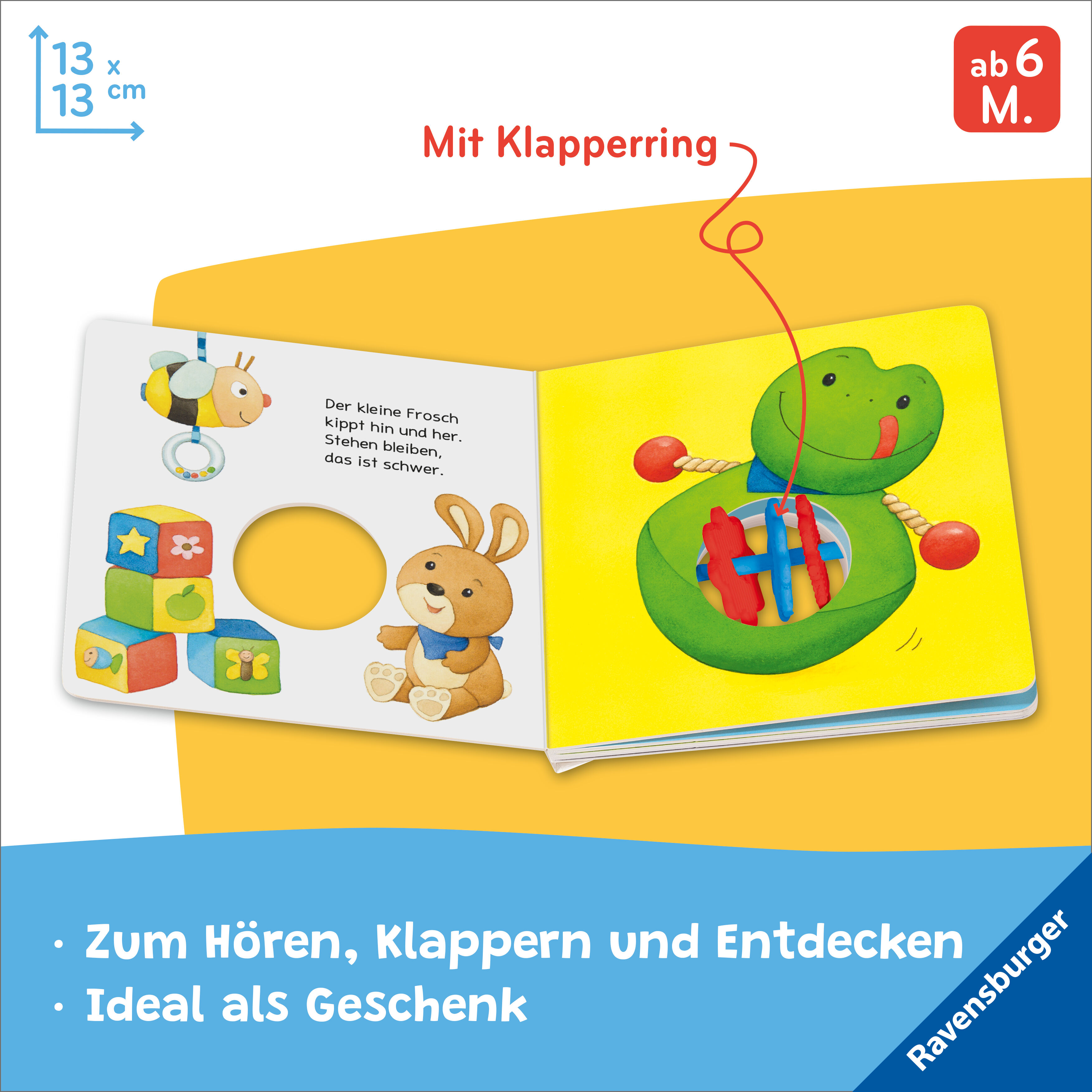 Großer Klapperspaß für kleine Kinderhände Was klappert denn hier? Auto, Frosch und viele andere Spielzeuge haben kunterbunte Klapperringe in ihrer Mitte. Schon die Kleinsten können dieses handliche und stabile Buch gut greifen und schütteln und damit selbst da...