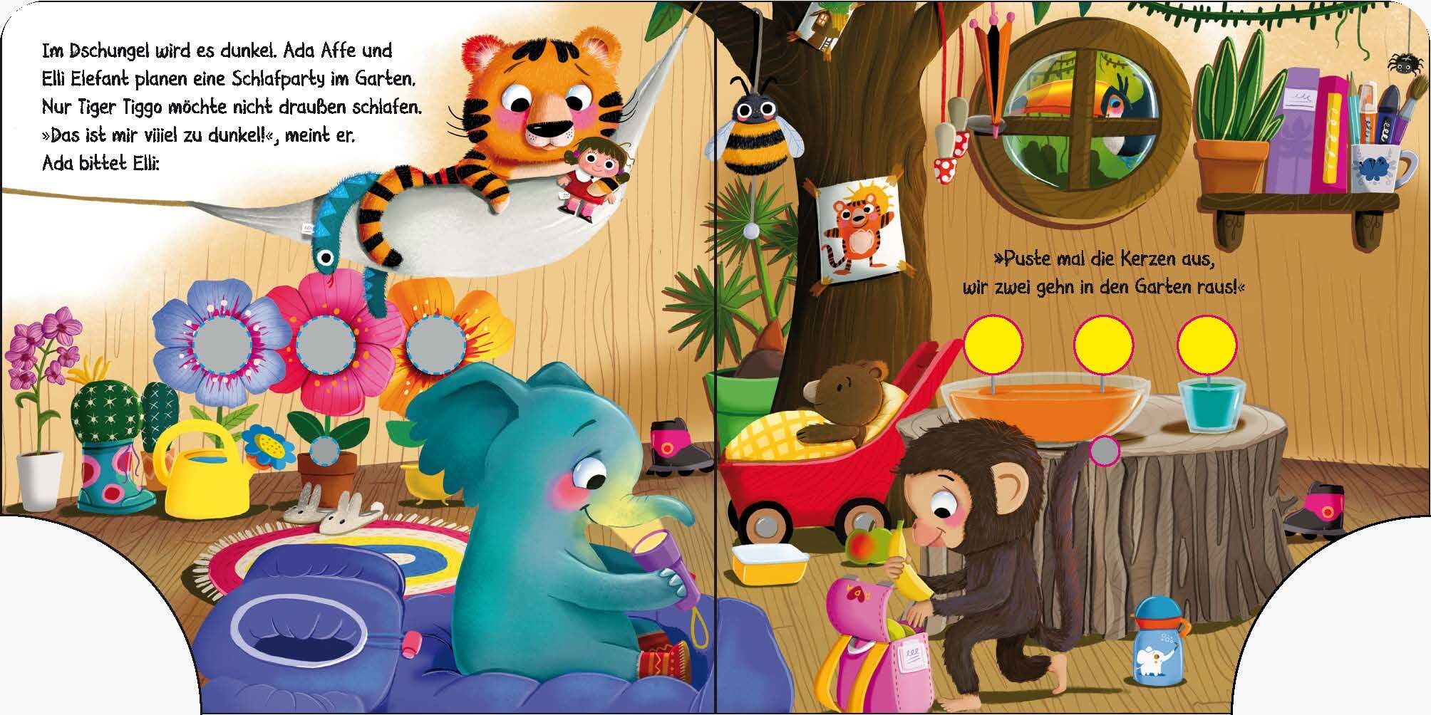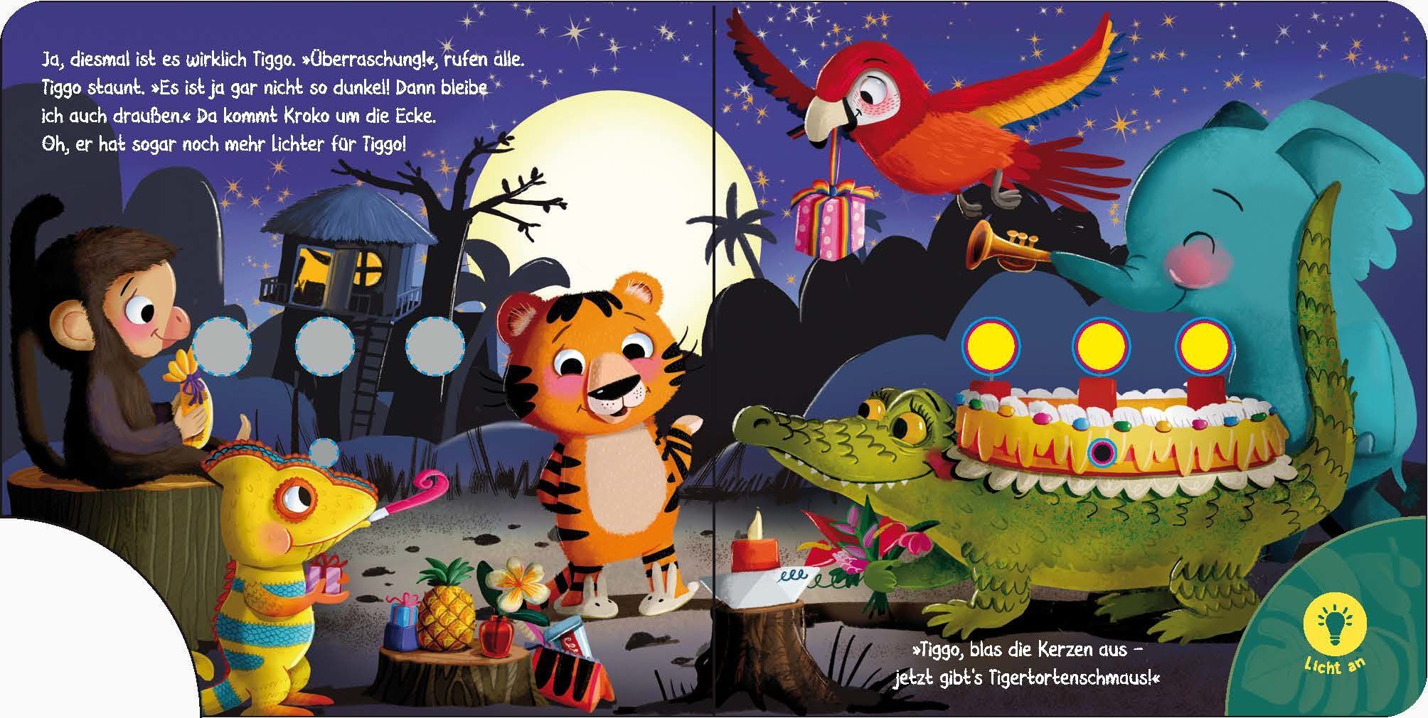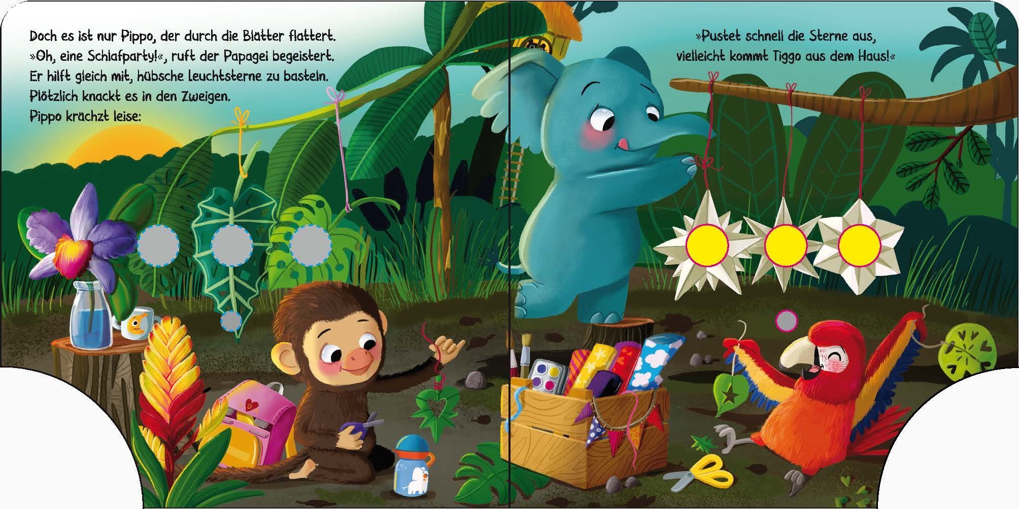 Ein zauberhaftes Übernachtungsabenteuer mit drei funkelnden LED-Lichtern zum Auspusten Die Tiere planen eine Schlafparty im Dschungel doch Tiger Tiggo will nicht mitmachen. Er hat einfach zu viel Angst, im Dunkeln draußen zu sein! Doch Elefant Elli und seine a...