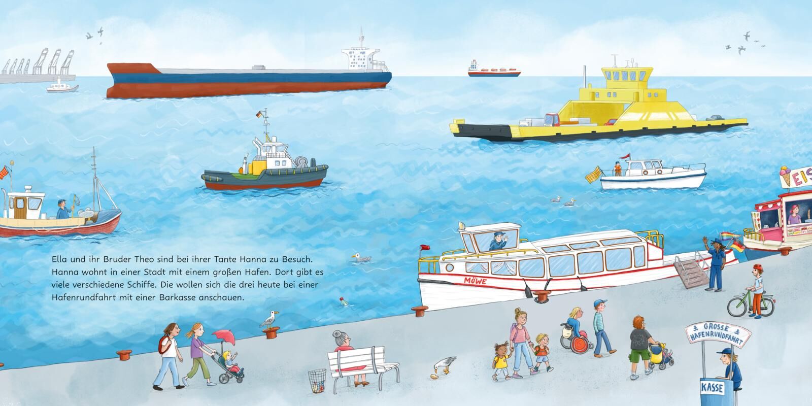 Spannendes Wissen für Schiffe-Fans ab 3 Jahren | Sachgeschichte mit detailreichen Illustrationen | kindgerecht aufbereitet und fachlich geprüft Ahoi und Leinen los! Ella, Theo und ihre Tante Hanna machen einen Ausflug in den Hafen. Dort gibt es viele verschie...