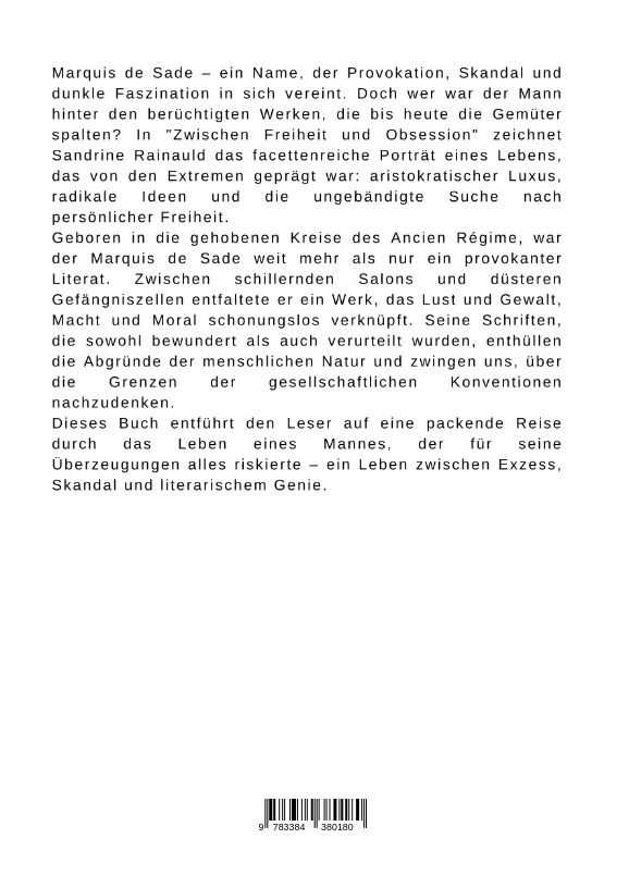 Marquis de Sade ein Name, der Provokation, Skandal und dunkle Faszination in sich vereint. Doch wer war der Mann hinter den berüchtigten Werken, die bis heute die Gemüter spalten? In "Zwischen Freiheit und Obsession" zeichnet Sandrine Rainauld das facettenreic...