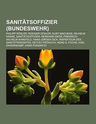Quelle: Wikipedia. Seiten: 37. Kapitel: Philipp Rösler, Rüdiger Döhler, Kurt Machens, Wilhelm Krane, Sanitätsoffizier, Reinhard Erös, Friedrich Wilhelm Ahnefeld, Hans-Jürgen Dick, Inspekteur des Sanitätsdienstes, Detlev Fröhlich, Heinz S. Fuchs, Axel Ekkernkam...Quelle: Wikipedia. Seiten: 37. Kapitel: Philipp Rösler, Rüdiger Döhler, Kurt Machens, Wilhelm Krane, Sanitätsoffizier, Reinhard Erös, Friedrich Wilhelm Ahnefeld, Hans-Jürgen Dick, Inspekteur des Sanitätsdienstes, Detlev Fröhlich, Heinz S. Fuchs, Axel Ekkernkamp, Hans Pongratz, Verena von Weymarn, Karsten Ewert, Peter K. Fraps, Torsten Sohns, Ulrich Pracht, Jürgen Blätzinger, Joachim Pröhl, Erich Wolfgang Bick, Christoph Veit, Stabsarzt, Dieter Willers, Wolfgang Nissen, Peter-Klaus Witkowski, Reinhard Schaefer, Erich Rödig, Erika Franke, Kay Staack, Christoph Büttner, Winfried-Götz Berger, Kurt Felkl, Matthias Jaeger, Lutz Bandekow, Inspizient Zahnmedizin der Bundeswehr, Ernst Schubert, Dirk Raphael, Armin Wandel, Hartmut Siebertz, Gerhard Bleimüller, Rainer Pinnow, Horst Robbers, Reiner Künzl, Dietrich von Hein, Björn Mirow, Hartmut Nöldeke, Frank Schindelhauer, Volker Schwamborn, Alfred Zimmer, Bernd Merkel, Inspizient Wehrpharmazie der Bundeswehr, Johann Maria Farina XIX, Arno Roßlau, Wilhelm Stelter, Ernst Müller-Troschel, Friedrich-Albert Richarz, Herbert Frößler, Ernst Ebeling, Gebhard Greiling, Hanns Heidemanns, Achim Andexer, Günther Brassel, Ingo Patschke, Hermann Ammermüller, Horst-Wolfgang Heise, Inspizient Veterinärmedizin der Bundeswehr, Erwin Lauschner, Hans-Dieter Schmidt, Jürgen Macheleidt, Rolf Kirchem, Hans Wolfgang Hammen, Klaus-Theodor Fliedner, Dieter Nordholz, Michael Krohn, Klaus Meurers, Hans-Joachim Hildebrandt, Franz Xaver Gärtner, Wolfgang Barth. Auszug: Philipp Rösler ( 24. Februar 1973 in Khánh Hung, Südvietnam) ist ein deutscher Politiker sowie seit Mai 2011 Bundesminister für Wirtschaft und Technologie, Bundesvorsitzender der FDP und deutscher Vizekanzler. Von Februar bis Oktober 2009 war Rösler Minister für Wirtschaft, Arbeit und Verkehr sowie Stellvertretender Ministerpräsident des Landes Niedersachsen im Kabinett Wulff II. Von 2009 bis 2011 war er Bundesminister für Gesundheit. Rösler stammt aus Vietnam und wurde um den 24. Februar 1973 in dem Dorf Khánh Hung (heute ein Teil von Sóc Trang) während des Vietnamkrieges geboren. Sein genaues Geburtsdatum ist unbekannt. Der 24. Februar 1973 wurde später amtlich festgelegt. Nach seiner Geburt wurde er namenlos an ein katholisches Waisenhaus in Saigon abgegeben. Im Alter von neun Monaten adoptierte ihn das niedersächsische Ehepaar Rösler und er wurde im November 1973 in die Bundesrepublik Deutschland geholt. Die vierköpfige Familie mit zwei Töchtern nahm Rösler bei sich auf und nannte ihn Philipp. Als Philipp Rösler vier Jahre alt war, trennten sich seine Eltern und er wuchs bei seinem Vater, einem Fluglehrer der Bundeswehr, in Hamburg, Bückeburg und Hannover auf. Im Jahr 1992 legte Rösler an der Lutherschule Hannover das Abitur ab. Im selben Jahr trat er als Sanitätsoffizieranwärter in die Bundeswehr ein. Für ein Studium der Humanmedizin an der Medizinischen Hochschule Hannover wurde er freigestellt. 1999 begann er eine Facharztausbildung zum Augenarzt am Bundeswehrkrankenhaus Hamburg. 2002 wurde er mit einer Arbeit über Rhythmusstörungen nach Herz-OPs und deren medikamentöse Behandlung (Herz-Thorax-Gefäßchirurgie) zum Dr. med. promoviert. 2003 verließ er die Bundeswehr als Stabsarzt und brach seine Facharztausbildung ab, um sich auf seine Arbeit als FDP-Landespolitiker in Niedersachsen zu konzentrieren. Rösler ließ sich im Jahre 2000 taufen und trat der römisch-katholischen Kirche bei. Seit 2002 ist Rösler mit der Ärztin Dr. Wiebke Rösler verheiratet und sei...