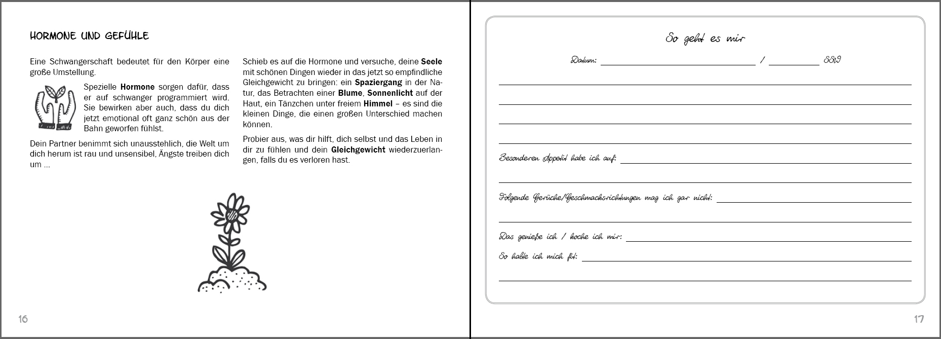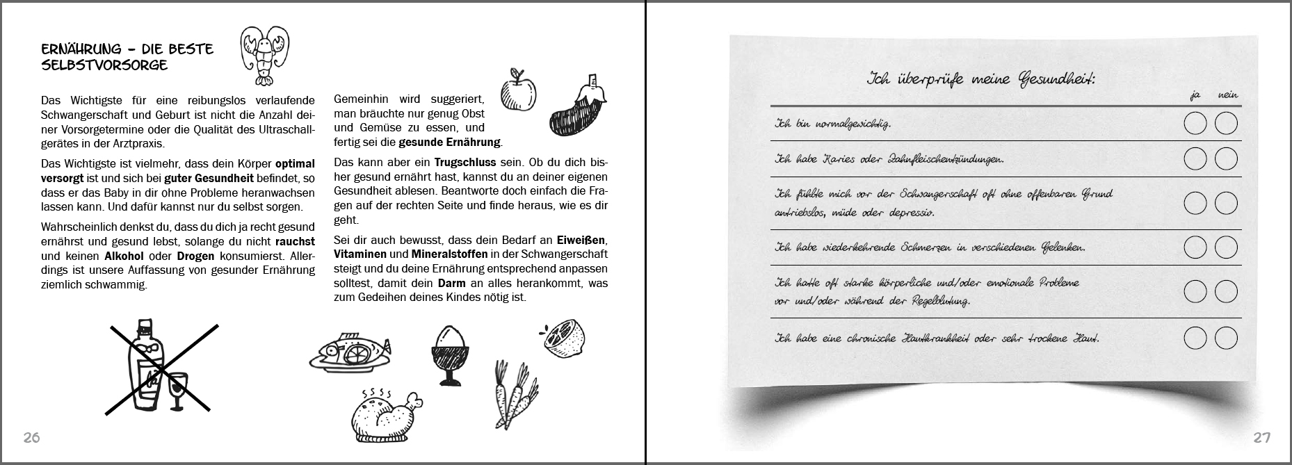 Schon schwanger!. oder übt ihr noch?. 7 Wenn es nicht gleich klappt . 8 Es wird ein Baby!. 11 Schwangerschaftsdauer und Entbindungstermin. 12 Die ersten 12 Schwangerschaftswochen. 15 Hormone und Gefühle. 16 Erste Hilfe bei Übelkeit. 20 Schwangerenvorsorge. 22 Ultraschall. 24 Ernährung - die beste Selbstvorsorge. 26 So erhielten die Urvölker ihre robuste Gesundheit. 28 Ein hoher Zuckerkonsum und seine Auswirkungen. 30 Keine Zeit zum Kochen?. 34 Das mittlere Schwangerschaftsdrittel. 35 Kindsbewegungen. 36 Lust aufs Reisen?. 38 Geburtsplanung. 42 Das letzte Schwangerschaftsdrittel. 47 Zeit zum Nestbauen. 48 Bestimmung und Optimierung der Kindslage. 52 Fit in die Geburt. 54 Schon im Becken?. 56 Unsere Säugetiernatur. 57 Praktische Vorbereitungen. 58 Das Baby kommt!. 59 Schmerz lass nach!. 60 Blasensprung. 64 Hilfe, grünes Fruchtwasser!. 66 Was tun bei einem Dammriss?!. 67 Die Herausforderungen der Übergangsphase. 68 Abnabeln - wie, wann und womit?. 70 Die Nachgeburtsphase: Geduld beugt Blutungen vor. 71 Das Wochenbett: Baby-Flitterwochen. 77 Stillen. 78 Die alte und die neue Form. 82 Kleine Schreikunde und hilfreiche Tricks. 84 Mythos Durchschlafen. 86 Der erste Schnupfen. 88 Bärchen, Schnuller und andere Ersatzobjekte. 92 Mein Wohlfühl-Barometer durch Schwangerschaft und Wochenbett. 94 Nährstoffreiche Rezepte für Schwangerschaft, Wochenbett und danach. 97 Hinweise. 98 Knochenbrühe. 99 Irish Stew (Irischer Eintopf). 99 Ungarisches Gulasch. 100 Lauchsuppe. 100 Kartoffelsuppe. 101 Grüne Bohnen-Eintopf. 101 Linseneintopf. 102 Asiatisch. 102 Bratheringe. 103 Kartoffelbrei. 103 Apfel-Möhren-Rohkost (Dessert oder Beilage). 104 Königsberger Dorschfilet. 104 Fischstäbchen. 105 Krautpfanne. 105 Kartoffeln und Quark. 106 Nudeln mit Tomatensoße. 106 Hühnerfrikassee. 107 Hühnersuppe. 10…
