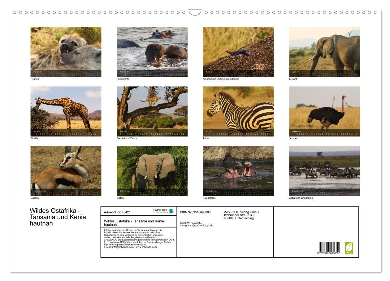 Erleben Sie die ungezähmte Schönheit Afrikas in beeindruckenden Bildern - von kleinen Eidechsen bis hin zu den majestätischen Riesen. Dieser Kalender nimmt Sie Monat für Monat mit auf eine visuelle Reise durch zwei der faszinierendsten Länder Ostafrikas - so n...