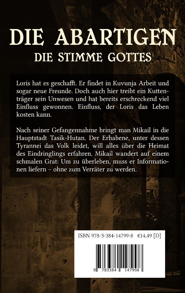 Weiter geht das Abenteuer der beiden Jungs. Wähnte sich Loris in Kuvunja in Sicherheit, wird er bald eines Besseren belehrt. Auch hier treibt ein Handlanger des Erhabenen sein Unwesen, zieht immer mehr Menschen auf seine Seite, sogar Mitglieder des Stadtrates....