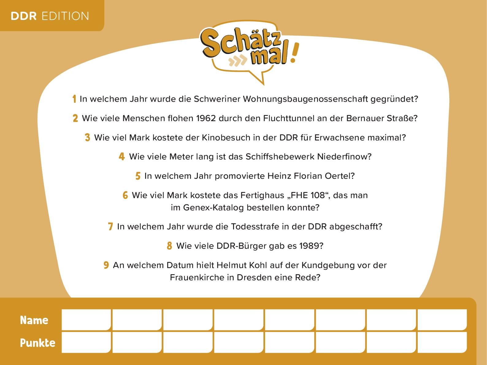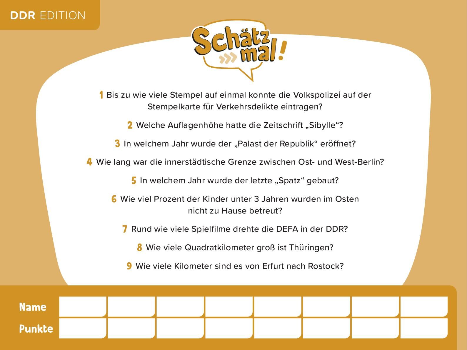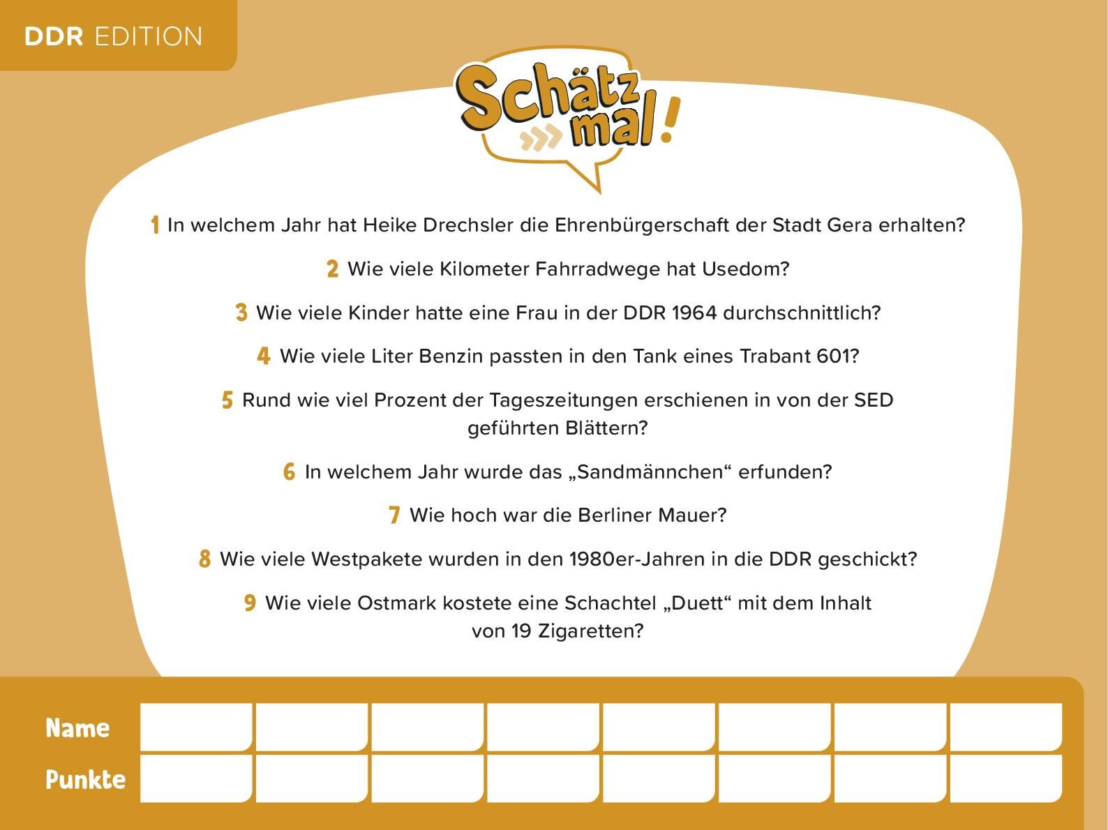 Schätz mal! Das Quiz mit Lach- und Staungarantie • In welchem Jahr schickte Udo Lindenberg seine Lederjacke an Erich Honecker? • Wie viel Prozent aller Privathaushalte in der DDR hatten 1990 ein Telefon? • Wie viel DDR-Mark kostete die Typenrad...