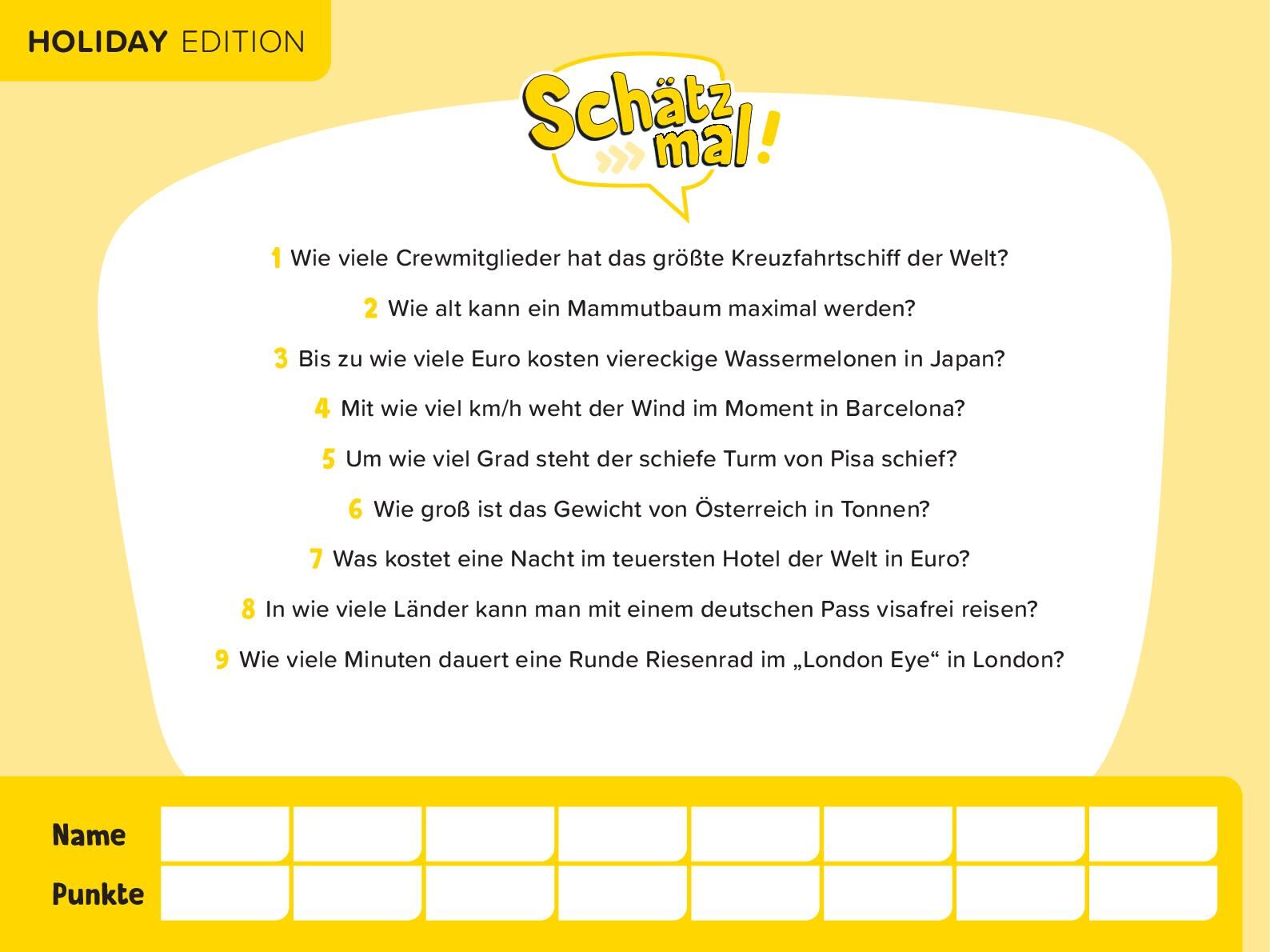 Schätz mal! Das Quiz mit Lach- und Staungarantie • Aus wie vielen Hauptinseln besteht Hawaii? • Wie viele Galerien haben die Vatikanischen Museen? • Wie viel Liter Treibstoff passen in den Tank des A380? Verrückt, unterhaltsam, mitreißend: Endl...