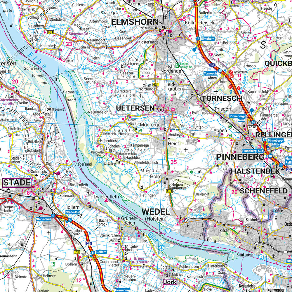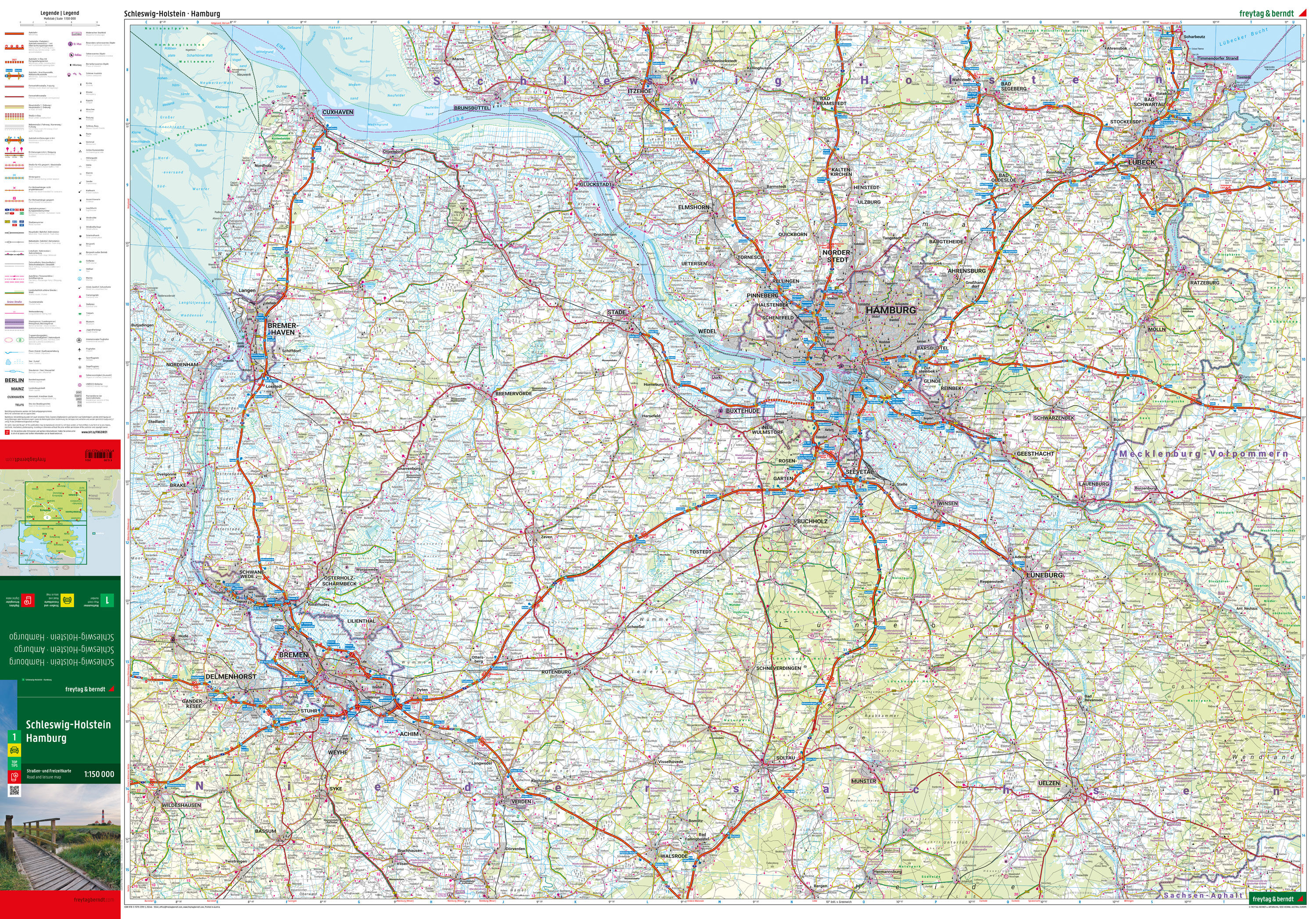 Mit der Straßenkarte Schleswig-Holstein - Hamburg im Maßstab 1:1 50.000 finden sich Urlauber die mit Auto, Motorrad oder Wohnwagen unterwegs sind bestens zurecht. Das weit verzweigte Straßennetz ist exakt abgebildet, Entfernungen und viele Ausflugsziele sind i...