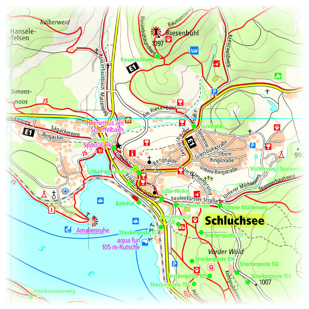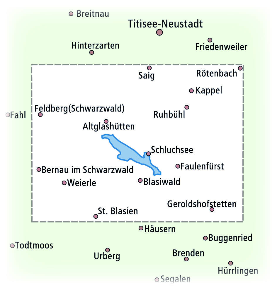 Der Schluchsee, Deutschlands höchstgelegene Talspere, bildet das Zentrum des Kartenausschnitts. Zu entdecken gilt es die einzigartige Natur und Kultur des Hochschwarzwaldes auf malerischen Wanderwegen. Die Anschlusskarte zum Feldberg bietet zahlreiche Tourenvo...