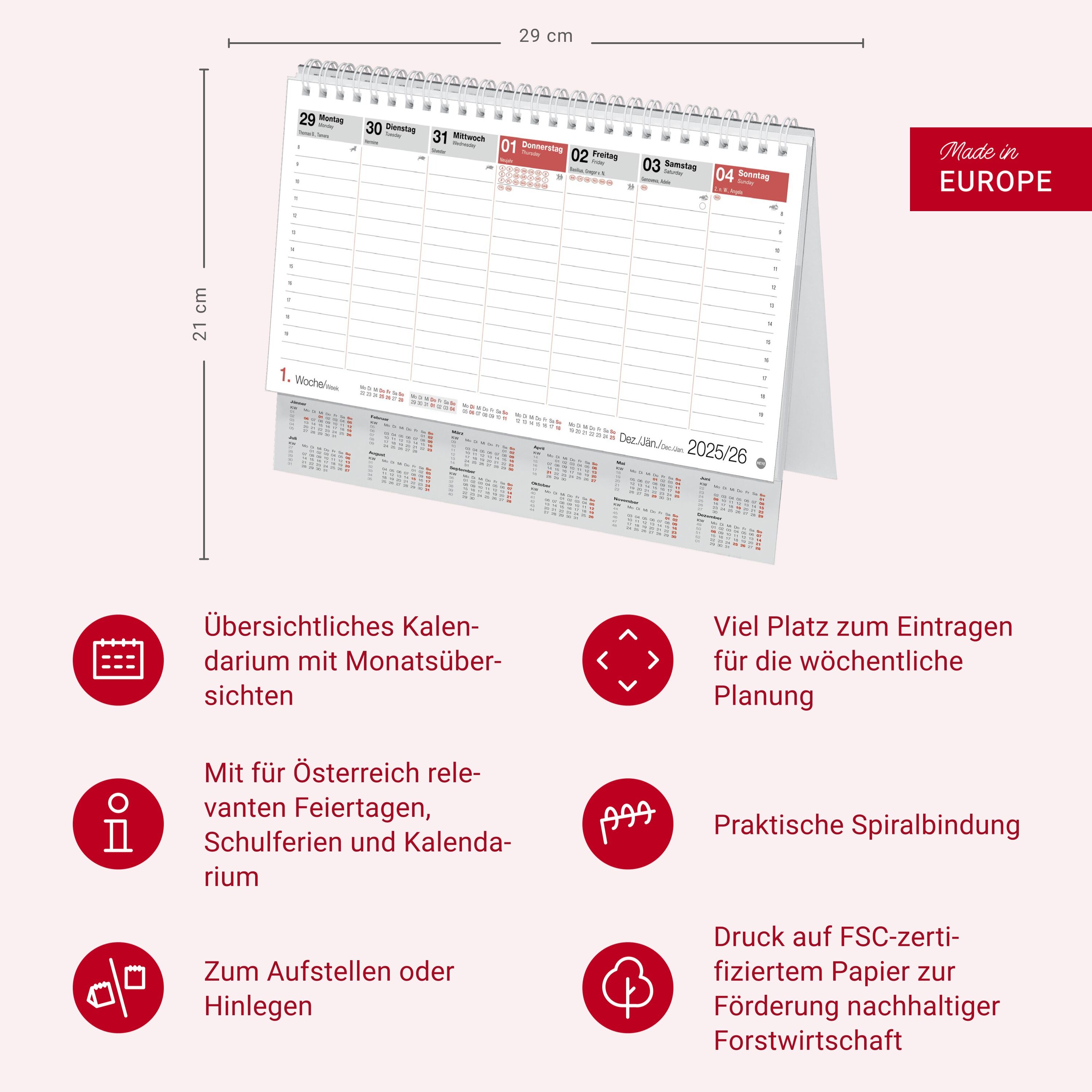 Der Kalender 2026 für Österreich mit Feiertagen: Wochenquerplaner im Format 29 x 21 cm - Alles sofort im Blick: Tischkalender zum Umklappen mit Schulferien in Österreich, wichtigen internationalen Feiertagen und Namenstagen - Klassisches Kalender-Design mit ...