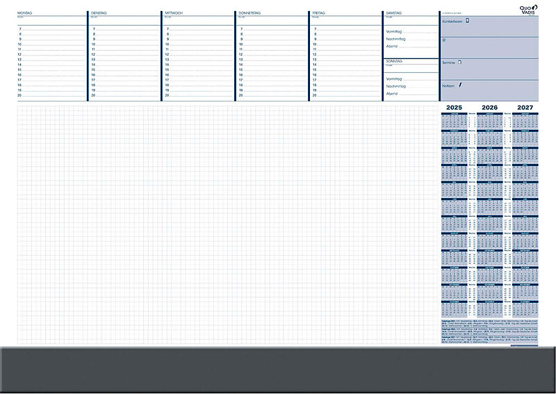 Schreibunterlag Perfektes Zeitmanagement, weniger Stress - Die Quo Vadis Büroagenda ist ein praktischer Helfer zum Planen Ihres Alltags. Da jeweils eine Woche auf einer Doppelseite sichtbar ist, haben Sie Ihre Woche stets im Griff. 1 Woche / 2 Seiten 59.5 x 4...