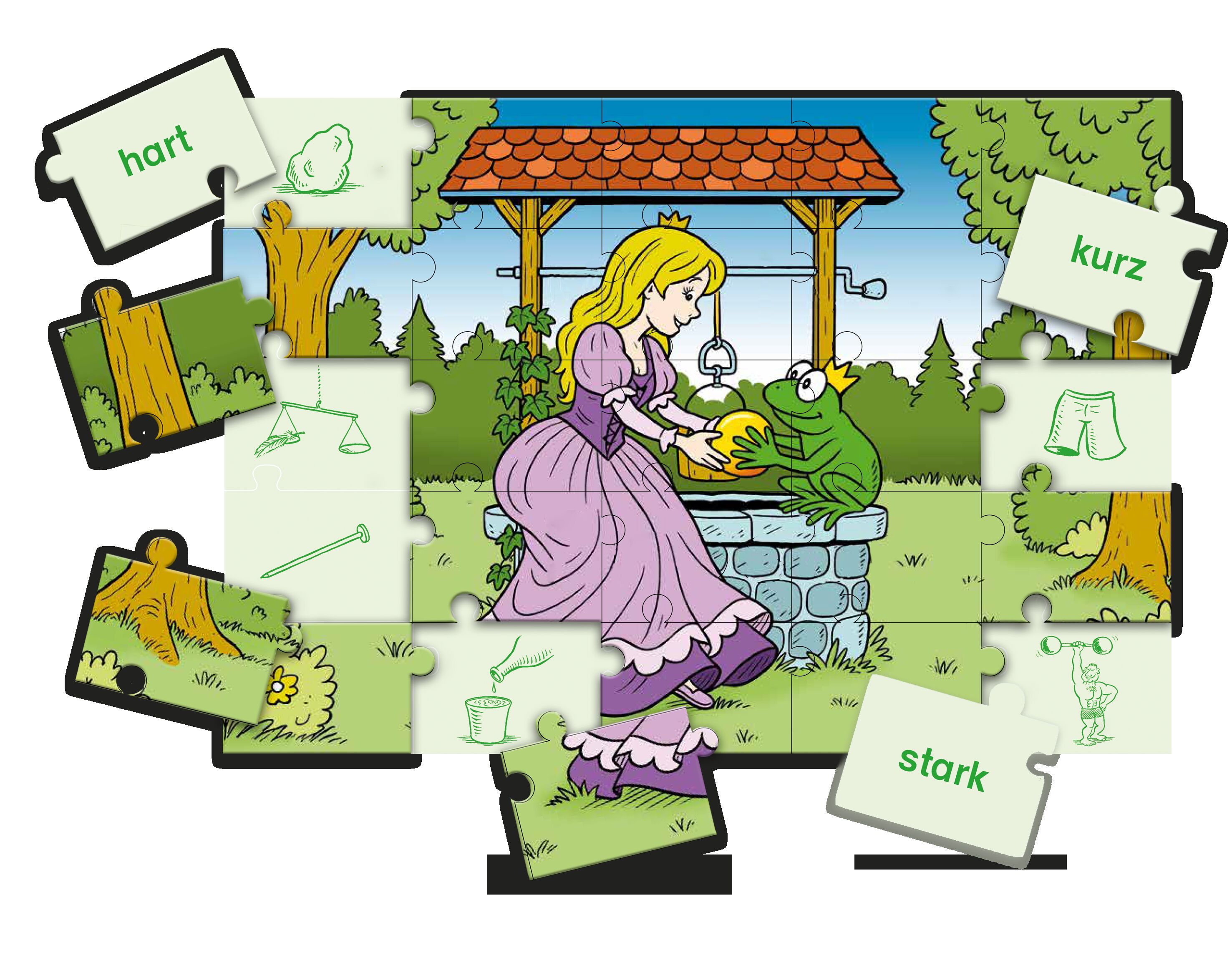 Lesen üben und spielerisch den Wortschatz erweitern: Einfach Bild-Wort-Paare finden und tolle Puzzlebilder entdecken! Die Wörter auf den Puzzleteilen müssen den Bildern auf der Grundtafel zugeordnet werden. So wird genaues Hinschauen geschult, der Wortschatz ...