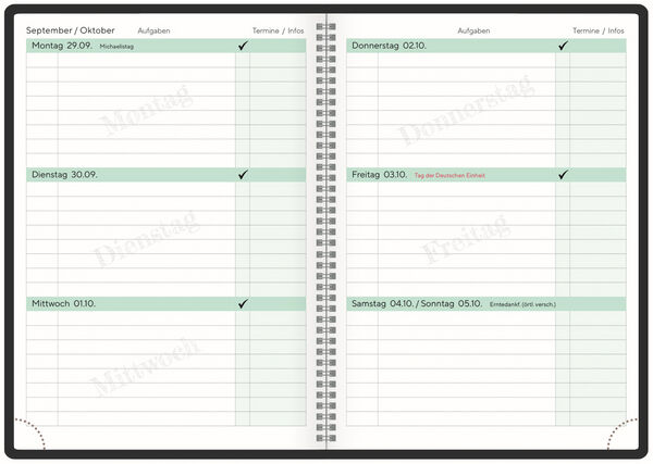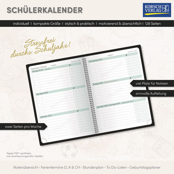 Produktmerkmale Schülerkalender im Format 14,8 x 21 cm, umweltfreundliches FSC Papier Platz zum Eintragen der Fächer, To-dos, Termine und Infos sowie eine kleine Spalte zum Häkchensetzen Extras: Stundenpläne, Notenübersichten, Schulferientermine für D, A, CH,...