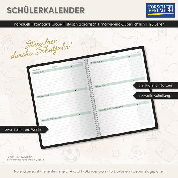 Produktmerkmale Schülerkalender im Format 14,8 x 21 cm, umweltfreundliches FSC Papier Platz zum Eintragen der Fächer, To-dos, Termine und Infos sowie eine kleine Spalte zum Häkchensetzen Extras: Stundenpläne, Notenübersichten, Schulferientermine für D, A, CH,...