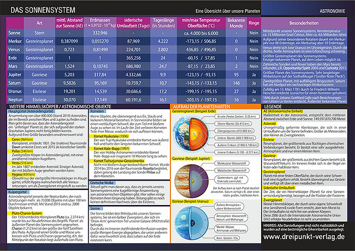 Mit dieser Info-Tafel hast du einen perfekten Überblick über alle wichtigen Objekte in unserem Sonnensystem. Du findest alle bekannten Planeten, die wichtigsten Monde, Kleinplaneten und Kometen - außerdem Beschreibungen der großen Asteroidengürtel im Sonnensys...