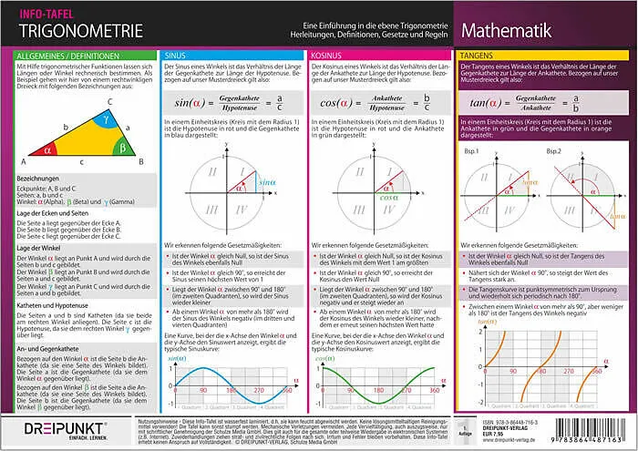 Längen oder Winkel können mittels trigonometrischer Funktionen berechnet werden. Auf dieser Info-Tafel werden Sinus, Kosinus, Tangens und Cotangens hergeleitet und anschaulich erläutert. Darüber hinaus werden die einzelnen Beziehungen zwischen den Funktionen d...