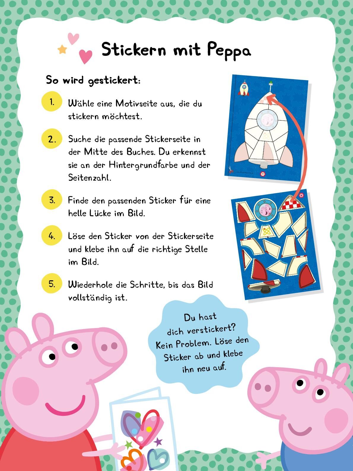 Sticker für Sticker tolle Bilder von Peppa puzzeln! • 14 Sticker-Motive mit den Lieblingsfiguren motivieren zum Puzzeln mit Stickern • Über 245 große Sticker, mit denen auch kleine Hände gut zurechtkommen • Vorgegebene Stickerflächen erleichter...