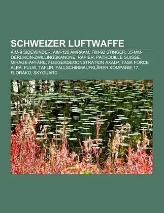 Quelle: Wikipedia. Seiten: 35. Kapitel: AIM-9 Sidewinder, AIM-120 AMRAAM, FIM-92 Stinger, 35-mm-Oerlikon-Zwillingskanone, Rapier, Patrouille Suisse, Mirage-Affäre, Fliegerdemonstration Axalp, Task Force ALBA, FULW, Taflir, Fallschirmaufklärer Kompanie 17, Flor...