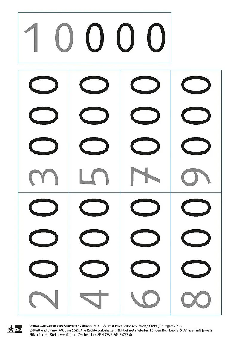 Das 5er-Pack passt zum neuen «Schweizer Zahlenbuch 4» und eignet sich für den Nachbezug zum Arbeitsheft und beinhaltet folgende Materialien: Ziffernkarten Stellenwertkarten Zeichenuhr