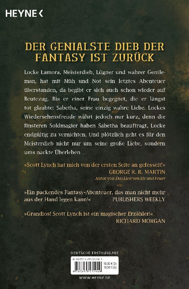 Fantasy im Breitwand-Format Locke Lamora ist zurück! Locke Lamora, Meisterdieb, Lügner und wahrer Gentleman, ist mit seinem Kumpan Jean nur knapp dem Piratentod entronnen. Nun ist er wieder auf Beutejagd, doch dann begegnet er einer Frau, die er längst tot gla...