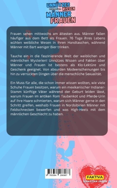 Frauen sehen mittwochs am ältesten aus. Männer fallen häufiger aus dem Bett als Frauen. 76 Tage ihres Lebens wühlen weibliche Wesen in ihren Handtaschen, während Männer mit Bart weniger Bier trinken. Tauche ein in die faszinierende Welt der weiblichen und männ...